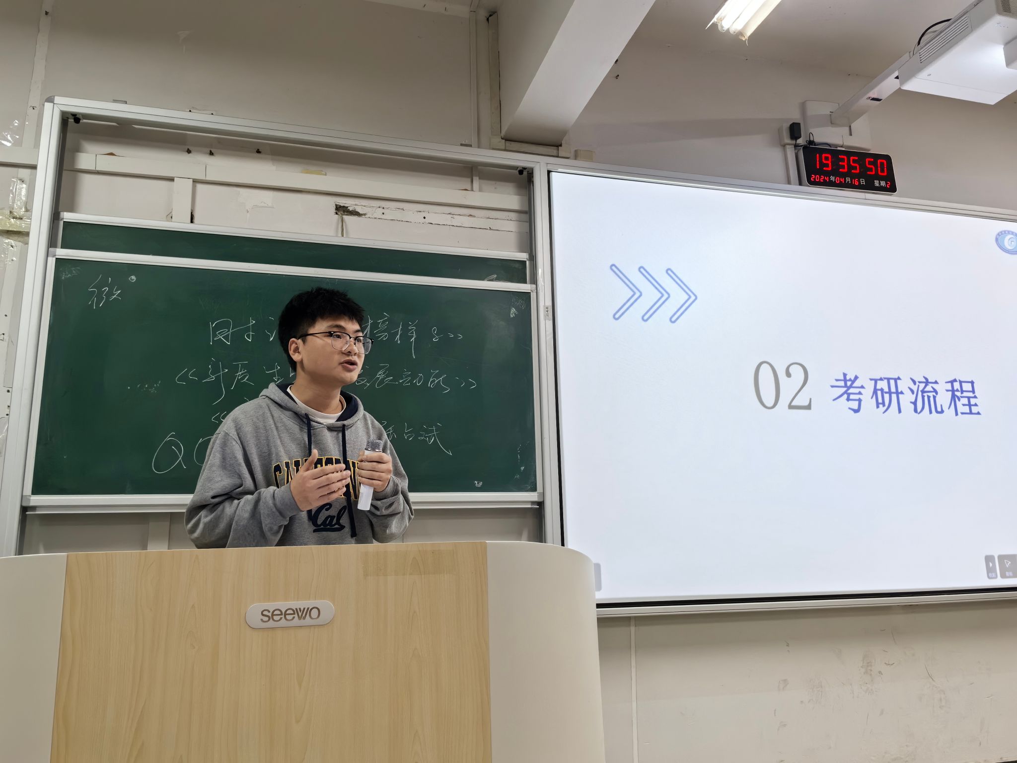 外国语学院舒星怡,考取北京航空航天大学硕士研究生。她分享了自己从日语专业跨考马克思主义理论专业的考研心得,着重为同学们讲解了如何调整考研复习心态,有效学习,拒绝内耗,立足自身设定计划,稳步前进。她提出,决定了就不害怕,努力了就不遗憾,踏路而行自有前程。
