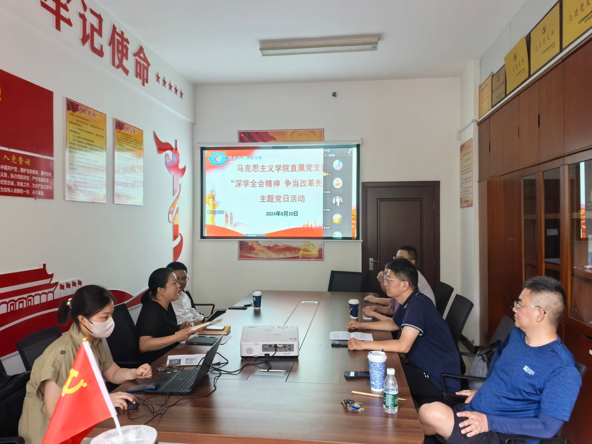 8月30日上午,马克思主义学院在主校区办公楼227会议室开展“深学全会精神 争当改革先锋”主题党日活动。会议由直属党支部书记刘东艳主持,全体党员参加,采取线上线下相结合的形式进行。