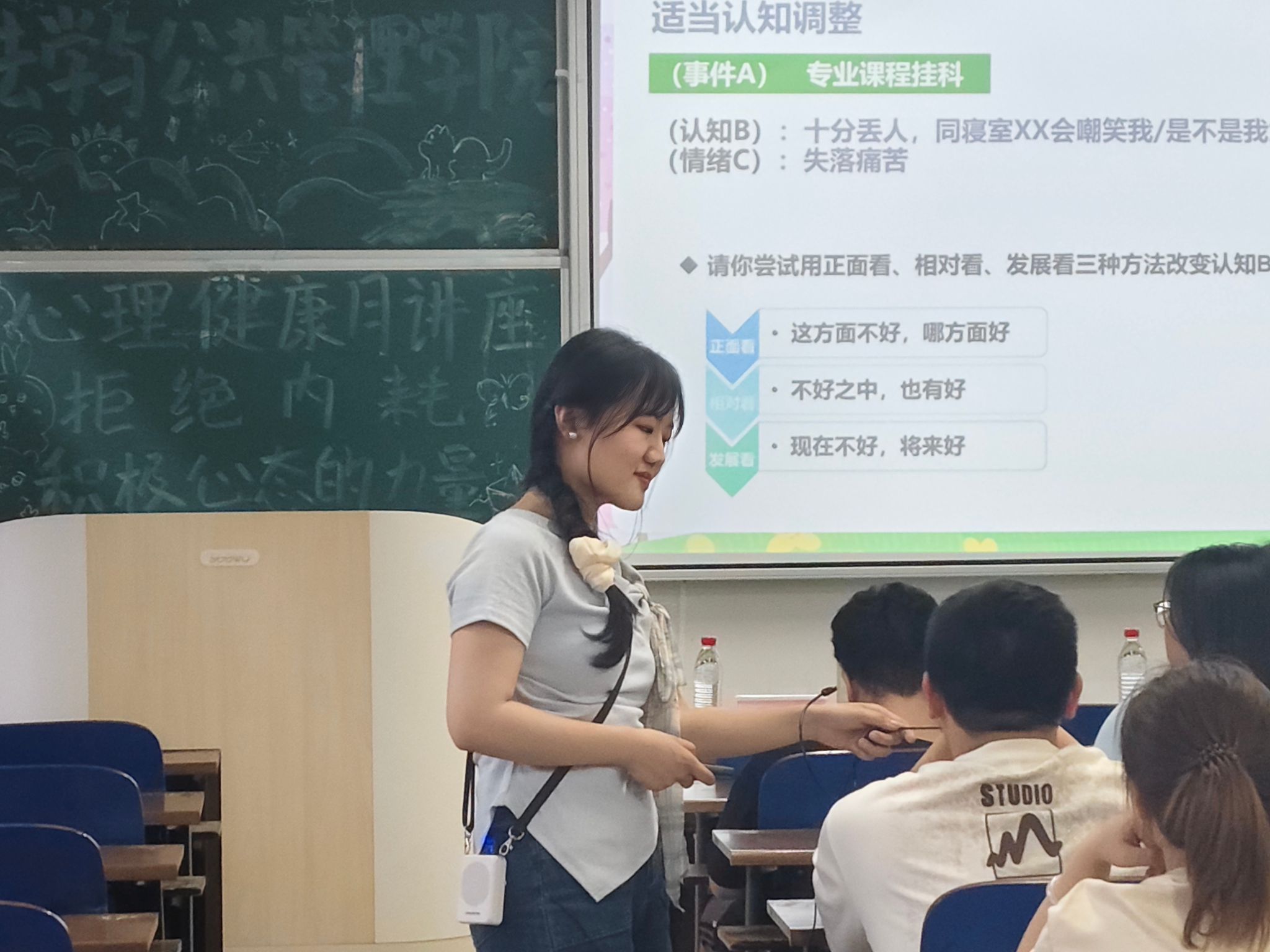 讲座中,向靓老师紧扣大学生身心健康、情绪管理、自我认知等关系大学生身心发展的问题,以生动案例引入主题,详细阐述在压力情境下,乐观情绪如何潜移默化地影响个体行为,并利用互动问答、心理测试等环节,引导大家认识到调整认知对改善情绪的重要性,将复杂的心理学理论转化为通俗易懂的知识。