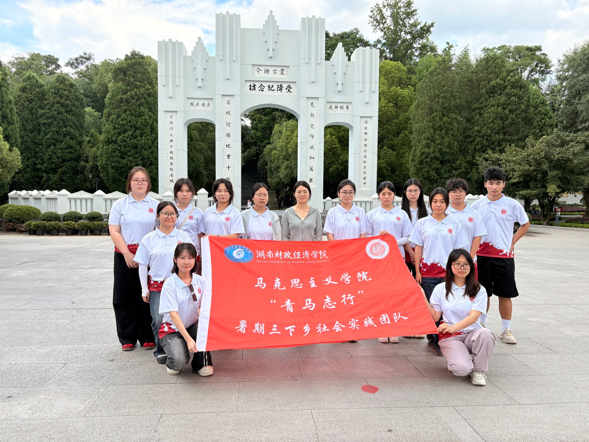 (图为“青马志行”队在中国人民抗战胜利受降纪念坊前合影)
