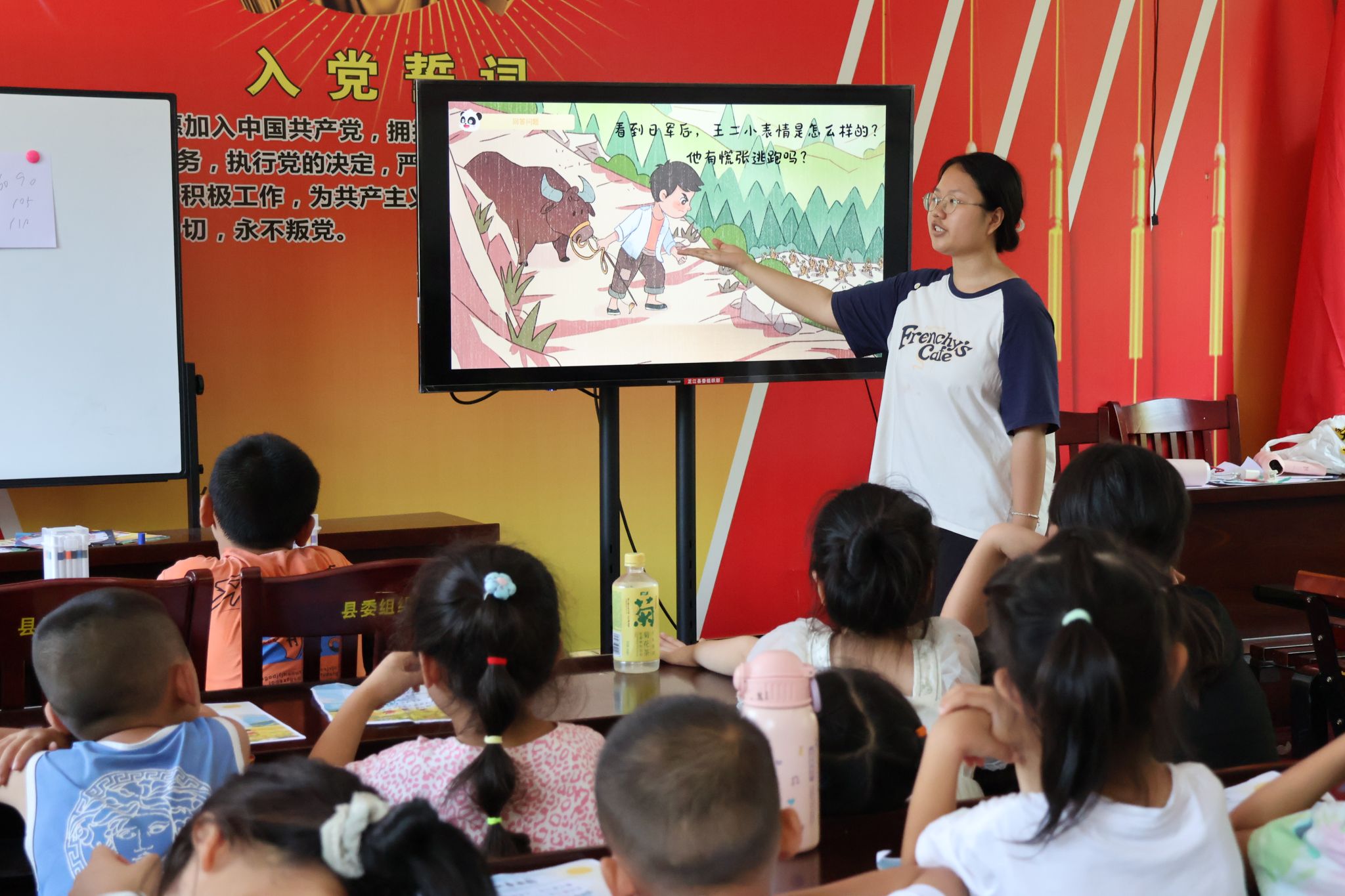 讲好革命故事,激发孩童兴趣。队员以生动的语言、丰富的表情、形象的视频,将少年英雄王二小的故事娓娓道来。从王二小在山坡上放牛,到侵略者进村扫荡,再到他机智地将敌人引入八路军埋伏圈,每一个情节都深深吸引着孩子们。从动情的讲述到角色的扮演,每一个课堂环节都让孩子们深切感受到英雄的无畏精神。