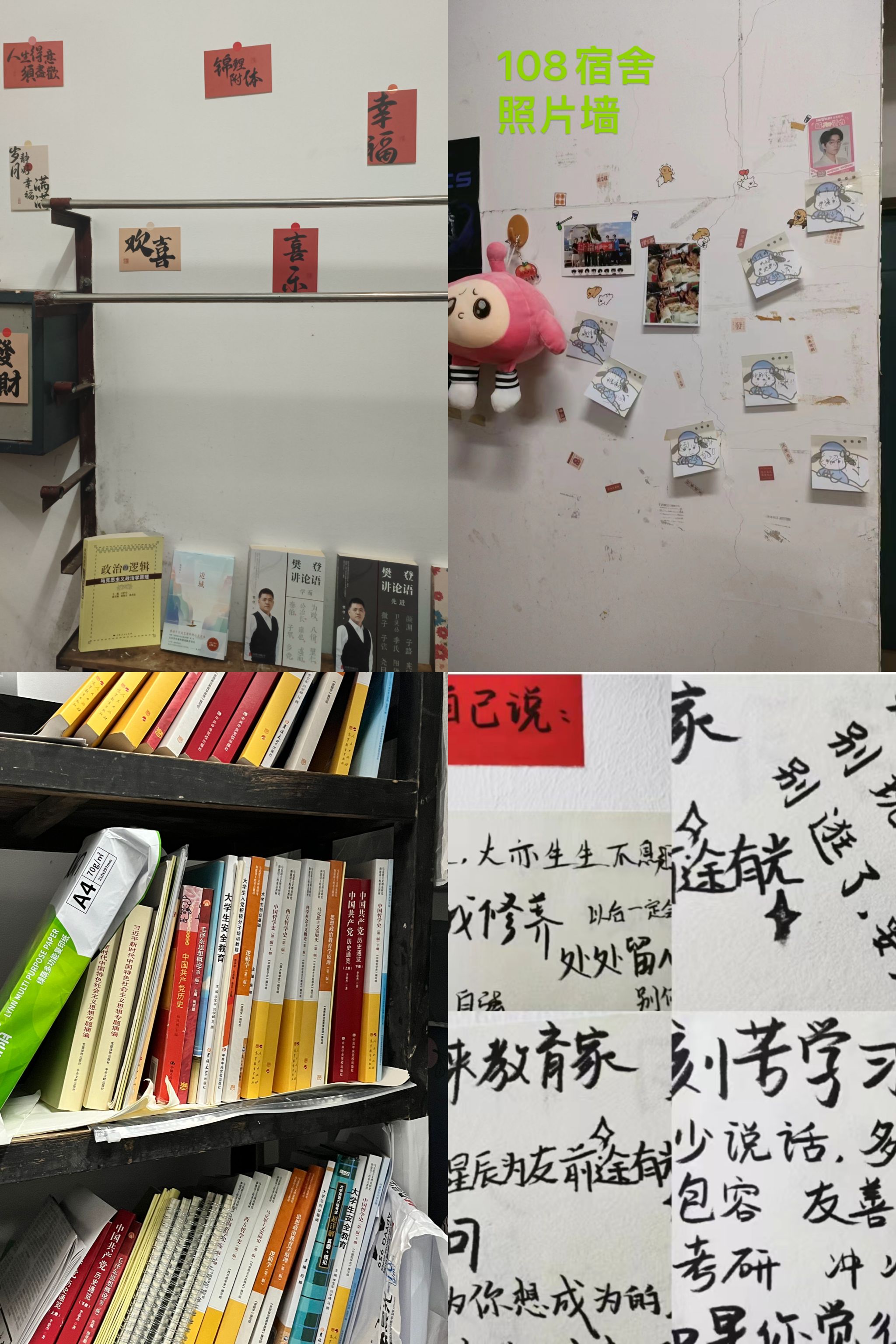 各寝室装扮风格多样,同学们纷纷将情感融入现实设计,贴上励志标语、打造特色读书角、对旧物进行创新性改造等,表达对美好大学生活的希冀,营造良好寝室文化氛围。