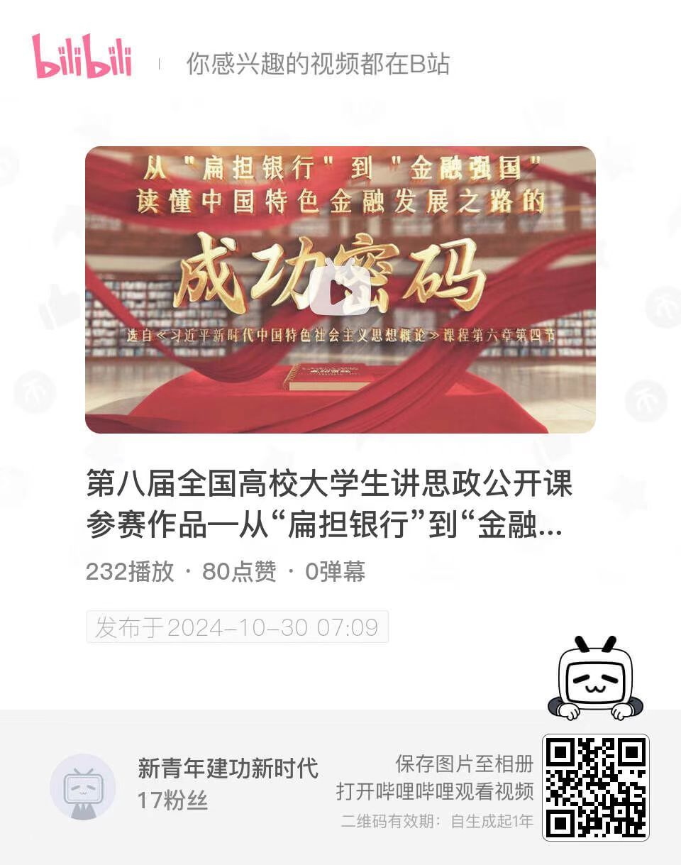 http://【第八届全国高校大学生讲思政公开课参赛作品—从“扁担银行”到“金融强国”读懂中国特色金融发展之路的成功密码-哔哩哔哩】 https://b23.tv/aC9Npih