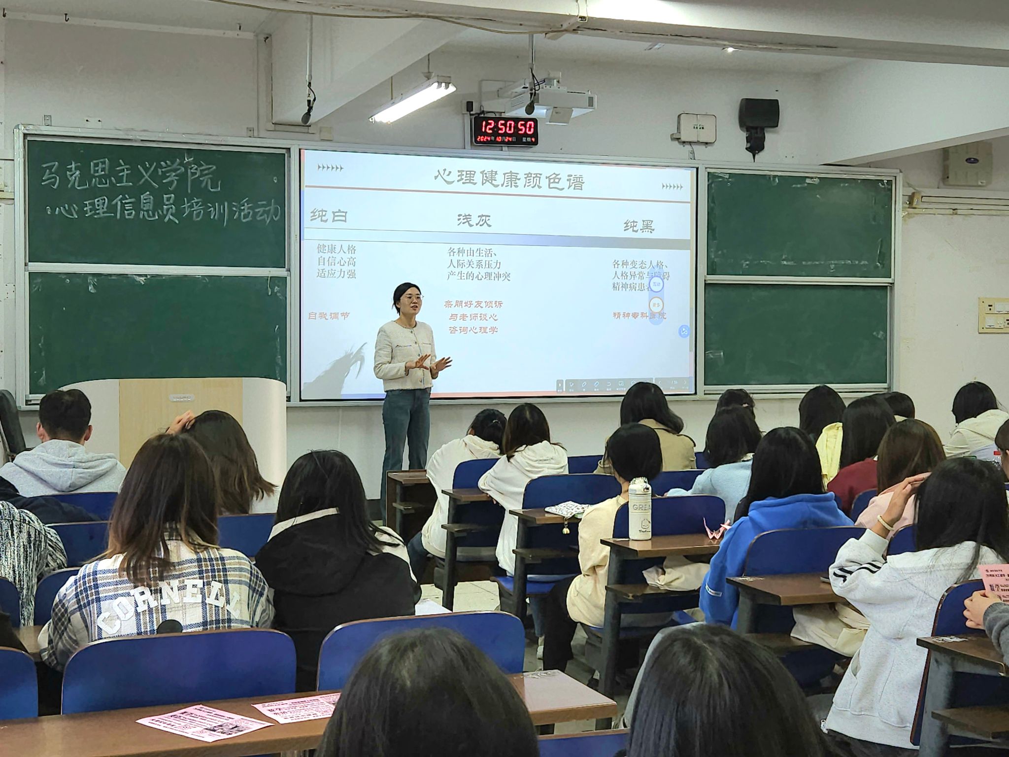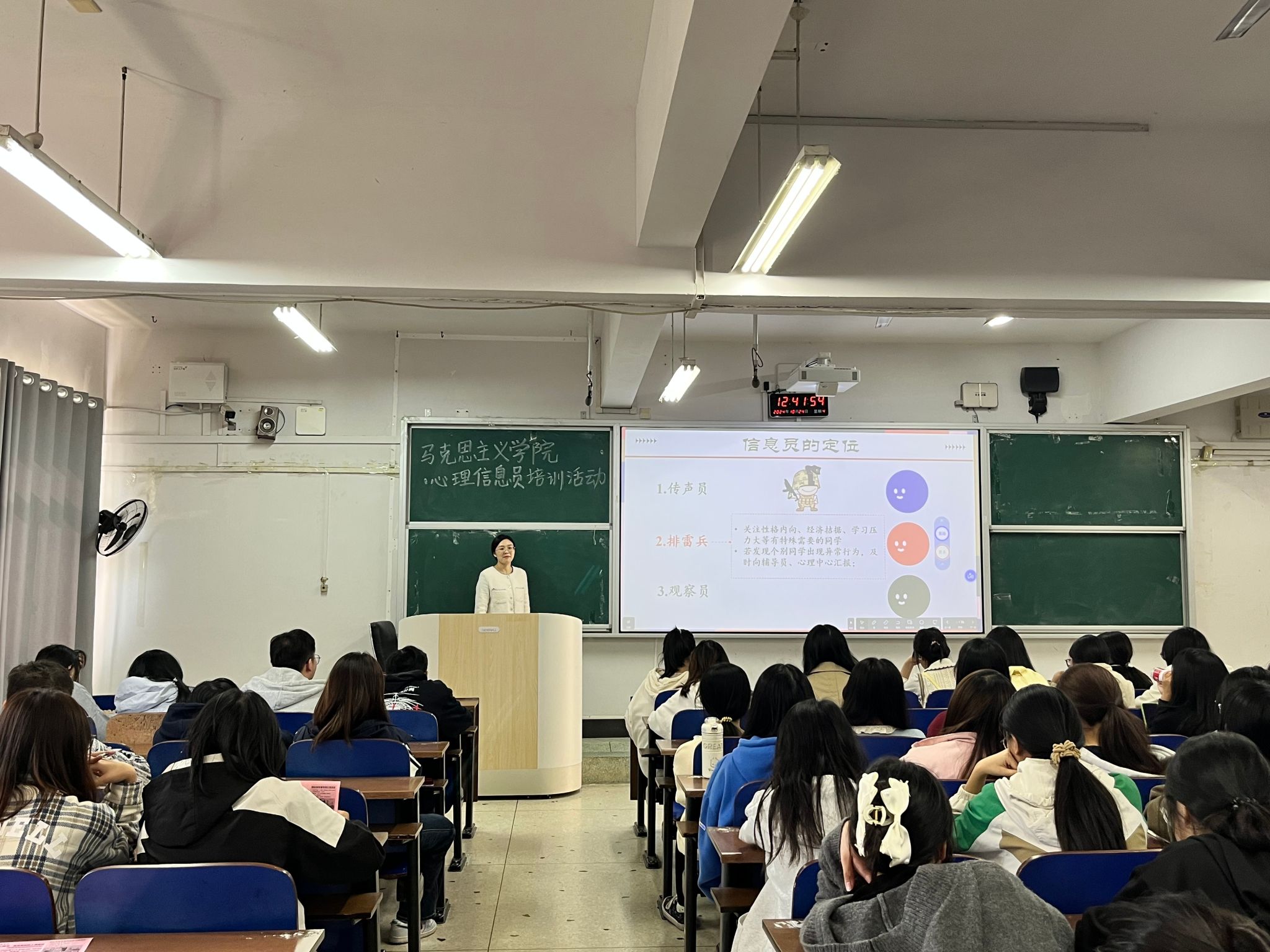 为进一步提升学院心理健康服务水平,充分发挥心理信息员在心理干预活动中的重要作用,10月24日中午,马克思主义学院于第三教学楼3110教室开展心理信息员培训。培训由学院心理专干周雄艳主讲,各班级心理委员、生活委员和寝室长参加。