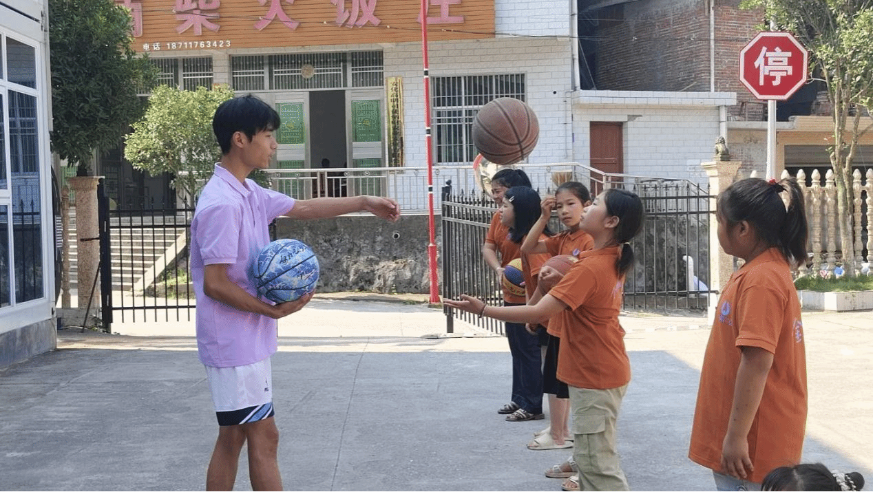 当日上午,体育课率先拉开序幕。“志愿先锋”队成员甘威旗老师带来跳绳与篮球教学,将两项运动巧妙结合:跳绳区里,孩子们随着绳子翻飞的节奏跳跃,单脚交替、双脚并跳的身影穿梭其间,银弧般的绳影与欢快的笑声交织;篮球区中,基础拍球、运球动作的示范教学吸引了众多孩子,他们模仿着老师的姿势,从笨拙拍击到逐渐找到节奏,“我能连续拍10下啦”的雀跃呼喊响彻场地,运动的活力在乡野间尽情释放。