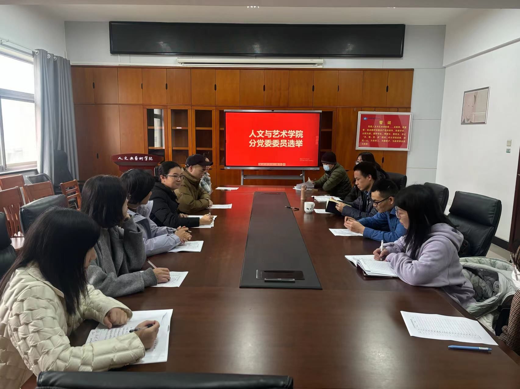 (本网讯)12月14日,人文与艺术学院教师党支部在行政楼817会议室召开党员大会,大会的主要议题包括学习习近平新时代中国特色社会主义思想、微党课讲授、投票选举分党委委员,并对陈洁书记年度党务工作进行评议。支部全体党员参加大会,会议由教师党支部书记陈洁同志主持。