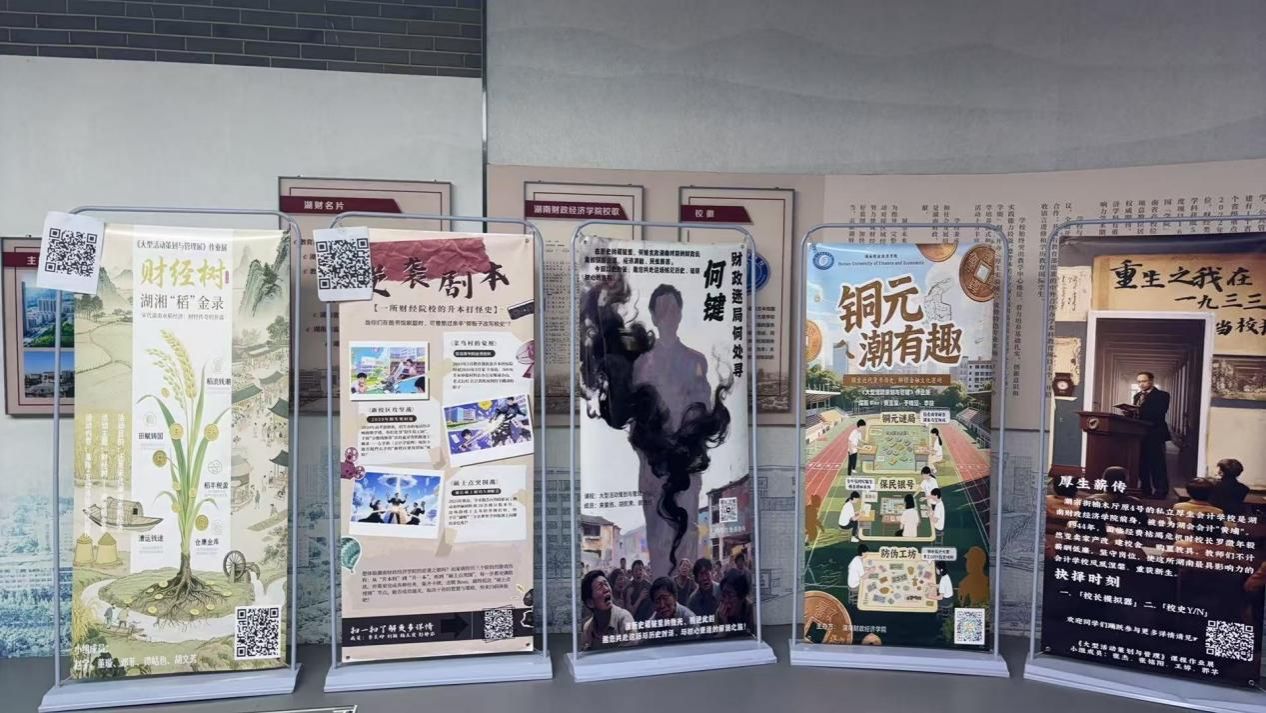 此次创意海报展以“湘遇财经,智汇未来——开启财经素养的探索之旅”为主题,旨在“启财经智慧,溯校史根脉,筑未来财商”。海报创意展由三大模块构成:“钱的时空之旅”、“厚生风华校史”、“湖南财经文化”。同学们运用《大型活动策划与管理》课程相关知识,集思广益,深入挖掘校史文化与财经脉络,遵循“有意思”与“有意义”的双重目标,基于“形意动”逻辑设计创意海报,撰写内容推文,配套趣味活动——立体化呈现财经校史解码成果。