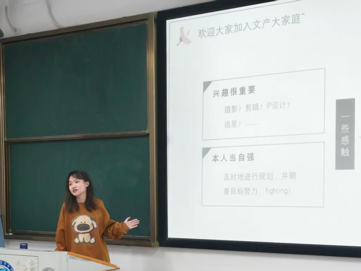 杨家辉老师从自身专业性角度出发,建议新生“以赛代练”,尝试将课本知识贯通应用与实践中,进而聚焦于研究探索自己喜欢的方向和能力。他在分享中强调社会“学科交叉融合”的趋势,并鼓励文产学生培养数据统计与项目分析能力,从而成为集文化管理、产业分析、艺术鉴赏等能力为一体的综合型人才。