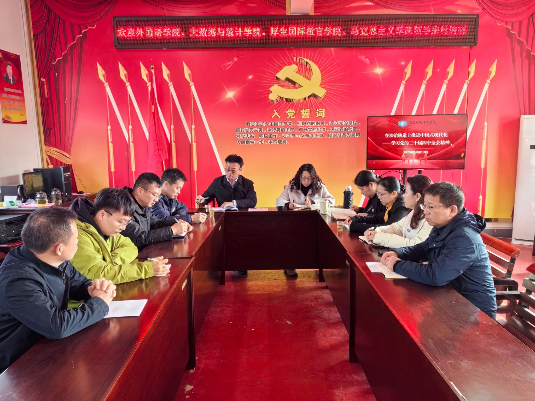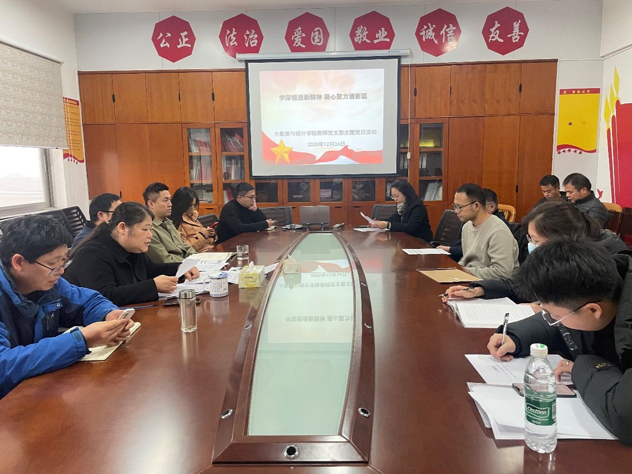 2025年12月24日下午,大数据与统计学院教师党支部在办公楼809会议室开展“学深悟透新精神,凝心聚力谱新篇”主题党日活动。本次活动由支部书记丁德琼主持,全体教师党员参加。会上,院党总支书记王萱为大家细致解读了党的二十届四中全会精神和省委十二届九次全会精神,深刻阐释了全会的重大政治意义、理论意义和实践意义。随后,支部书记丁德琼带领全体党员进一步认真学习党的二十届四中全会精神和省委十二届九次全会精神,并围绕学习内容展开了专题讨论。...