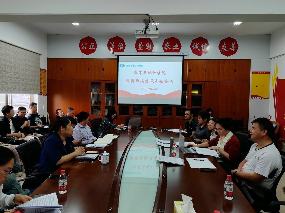 为深入贯彻落实党的二十大关于教育强国建设的战略部署,严格执行教育部《关于加强和改进新时代师德师风意见》及湖南省教育厅相关文件精神,数学与统计学院于4月23日下午在办公楼809会议召开师德师风建设专项会议,全院专任教师齐聚一堂,共同学习、研讨师德师风与课程思政的融合路径。会议由学院党总支书记王萱主持。