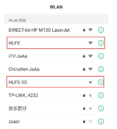 第一步:打开手机WLAN,连接HUFE-5G或HUFE热点,建议手机与支持5G笔记本连接5G频率的HUFE-5G速度更稳定、更快速。(特别提示:教职工一次认证登录不更换上网手机或笔记本可6个月内免除再次认证。)