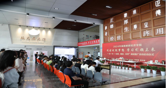 郭国强在致辞中对本次阅读推广活动的启动表示祝贺。他表示,开展读书行动,是从立德树人“根基”架起教育强国“柱梁”的战略安排,我们使命在肩,任重道远。他强调,各职能部门、二级学院要高度重视阅读推广工作,把“阅读成就梦想 学习引领未来”读书系列活动作为深入学习习近平新时代中国特色社会主义思想和社会主义核心价值观的有效形式,深化大学生思想文化教育的重要举措,认真做好宣传发动和组织领导工作,要积极搭建平台,创新活动形式,广泛调动全校师生参与活动的积极性、主动性;积极倡导读经典、读原著,唱响爱国爱党主旋律、传承红色基因、厚植爱国情怀、汲取前行力量,在书香浸润中不断提升思想道德修养和科学文化素质,营造浓厚的读书氛围,提高学生的阅读品味,形成全民阅读热潮,不断增强广大师生的文化涵养和生活品味,构建有特色的财院校园文化。希望广大学生踊跃参与到“一校一书”阅读推广活动上来,养成良好的阅读习惯,努力丰富自身知识储备。