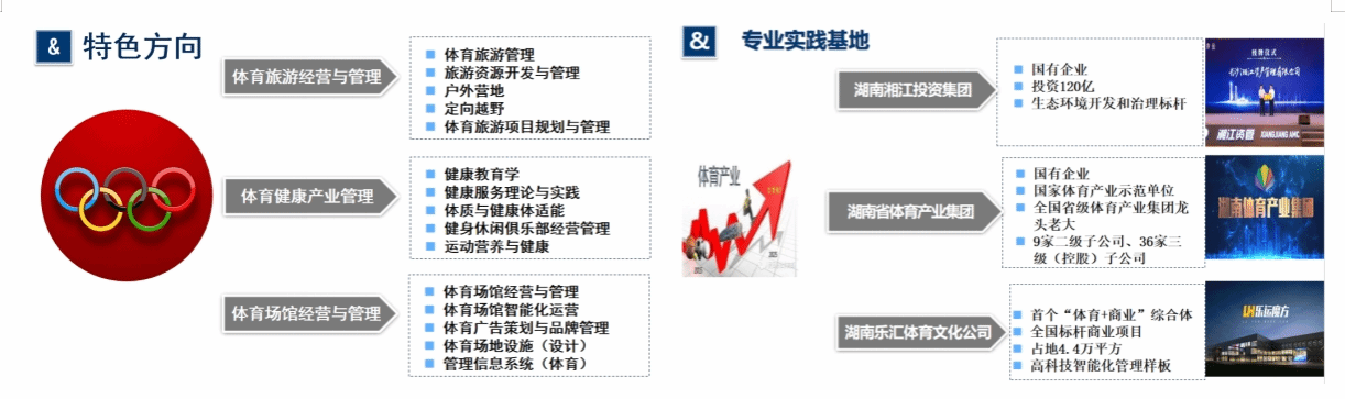 本专业秉持“体育+经济+管理”的学科交叉办学特色,以培养“懂经管的体育人、懂体育的经管人”为目标,对接市场需求,以体育旅游经营与管理、体育健康产业管理、体育场馆经营与管理为主方向,在传授基础理论知识的同时,也注重专业实践技能训练,培养立足于服务湖南,辐射中南及西南地区的综合型高素质人才,努力将体育经济与管理专业打造成“国内知名、省内领先、特色鲜明”的应用型本科专业。