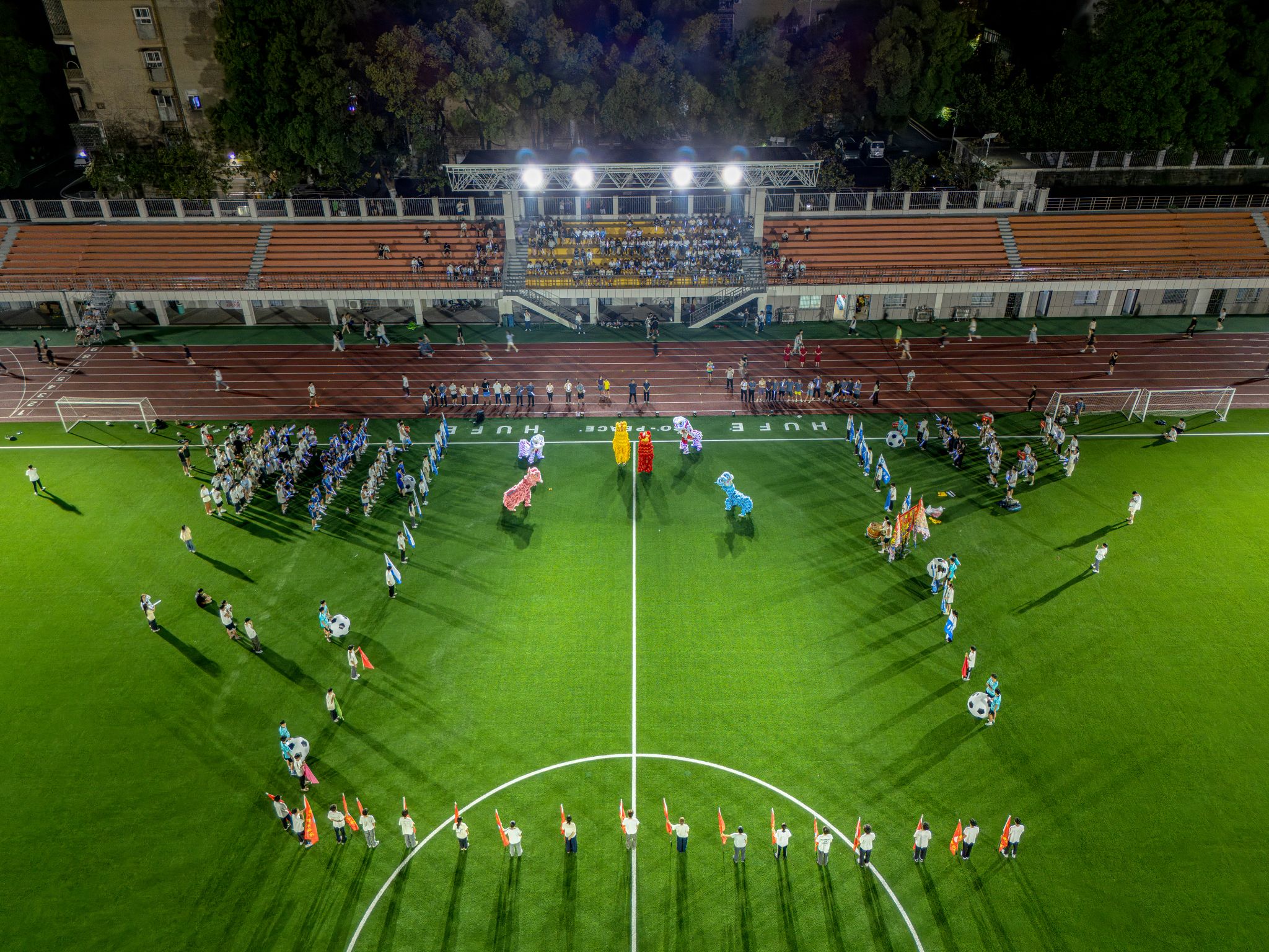 《龙狮欢腾,旗开得胜,逐梦未来》 开场表演震撼全场,17面院旗组成的彩旗队翩然入场,旗帜交错如流动彩虹,凝聚各学院特色,彰显学校整体风采;高杆金龙盘旋腾跃,以力与美的交融,诠释勇攀高峰的体育精神;六头祥狮(电光狮与传统狮交融)锣鼓震天中欢腾跃动,寄寓吉祥顺遂的美好祈愿;12名足球小将滚动巨型充气足球入场,将足球运动与青春梦想联结,以“梦想传递”仪式向嘉宾致敬,诠释团结奋进的体育内核。