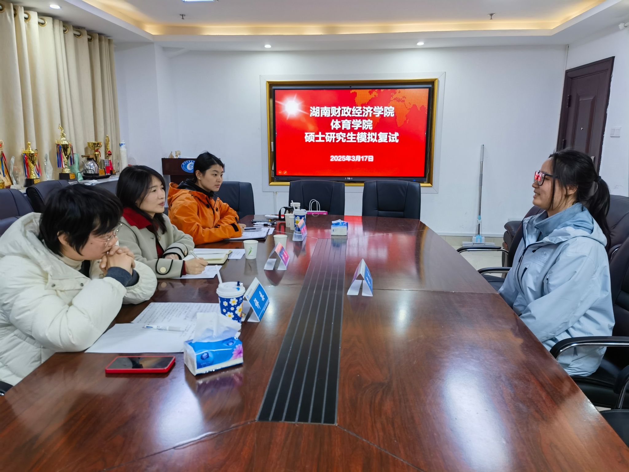 (本网讯)为助力考研学子提升考研复试竞争力,3月17日下午,体育学院在体育馆237、238会议室举办了考研复试模拟面试活动。由徐俊、曹智颖、家三爱、邓玉平、戴红梅五位老师组成评委团队,为考生提供全真模拟与精准指导。