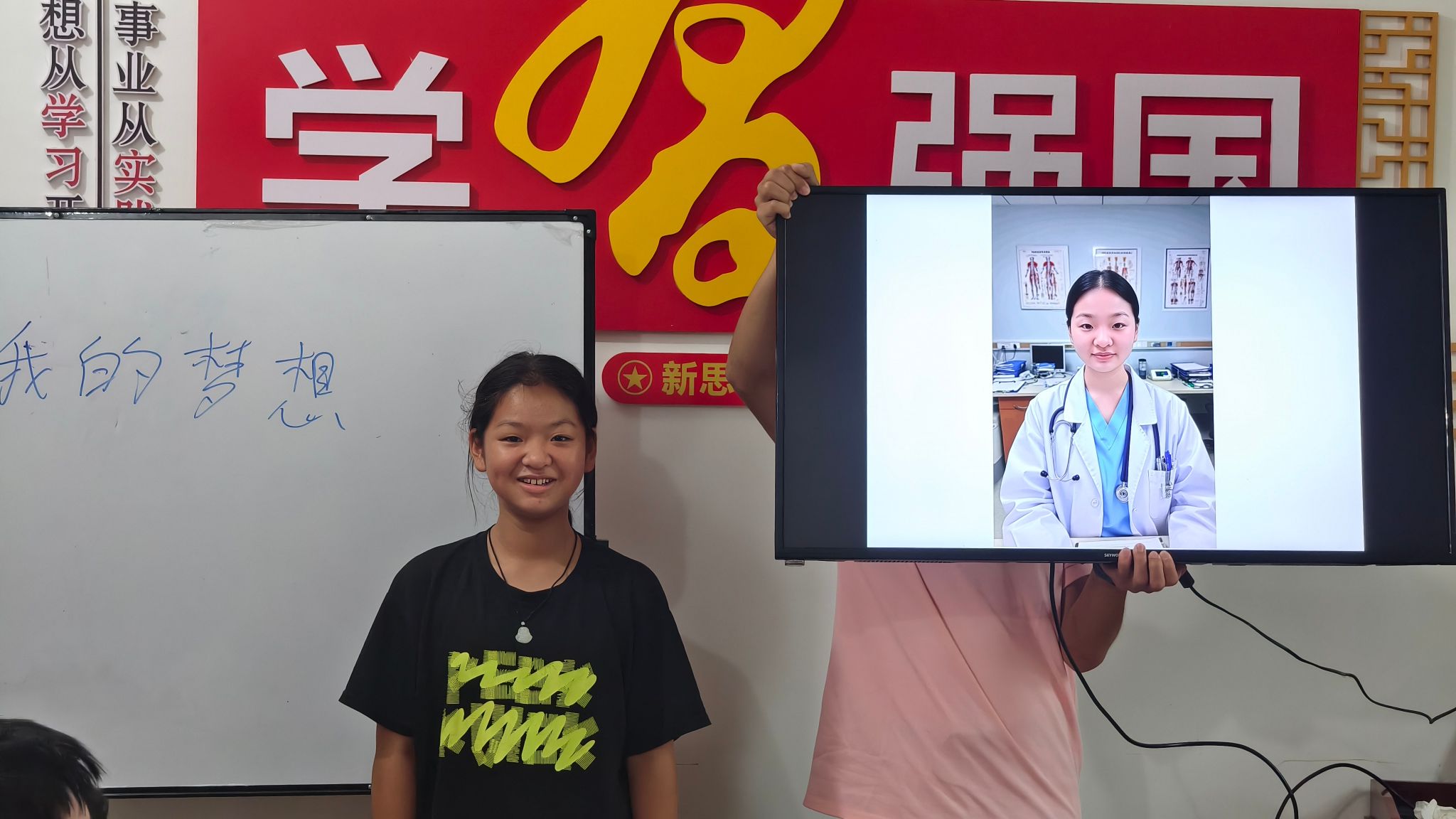 活动当天,孩子们期待的课堂正式开始。志愿者将孩子们前一天描述的梦想,运用AI图像生成技术,精心制作成一张张生动的“未来画像”。“哇!这真的是未来的我吗?”当屏幕上逐一呈现出身着军装英姿飒爽的“小战士”、医院里温柔细致的“小护士”……教室里爆发出阵阵惊叹与欢呼。AI技术的神奇魅力,将抽象的梦想瞬间变得清晰可见,极大地激发了孩子们对未来的向往和为之努力的决心。