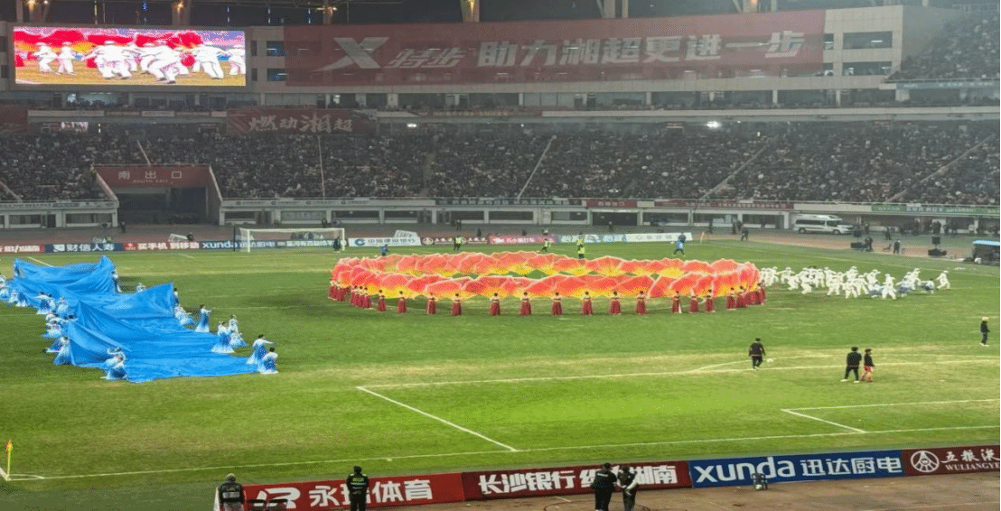 开幕式的文艺表演堪称视觉盛宴。舞者们手持彩绸扇踏乐而来,蓝色绸布翻飞如湘江潮涌,红橙渐变的扇阵舒展似烈焰升腾,刚柔并济间将湖湘文化的豪迈风骨与灵动气韵诠释得恰到好处,瞬间点燃全场热情,为这场巅峰对决铺就热烈序章。