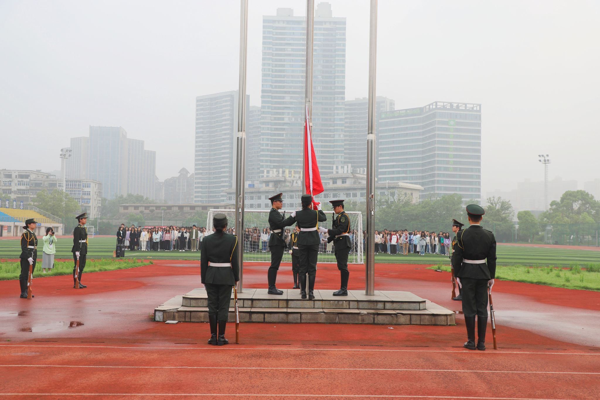 在全体师生的注视下,国旗护卫队护送五星红旗进场,伴随着庄严的国歌,五星红旗冉冉升起,迎风飘扬。