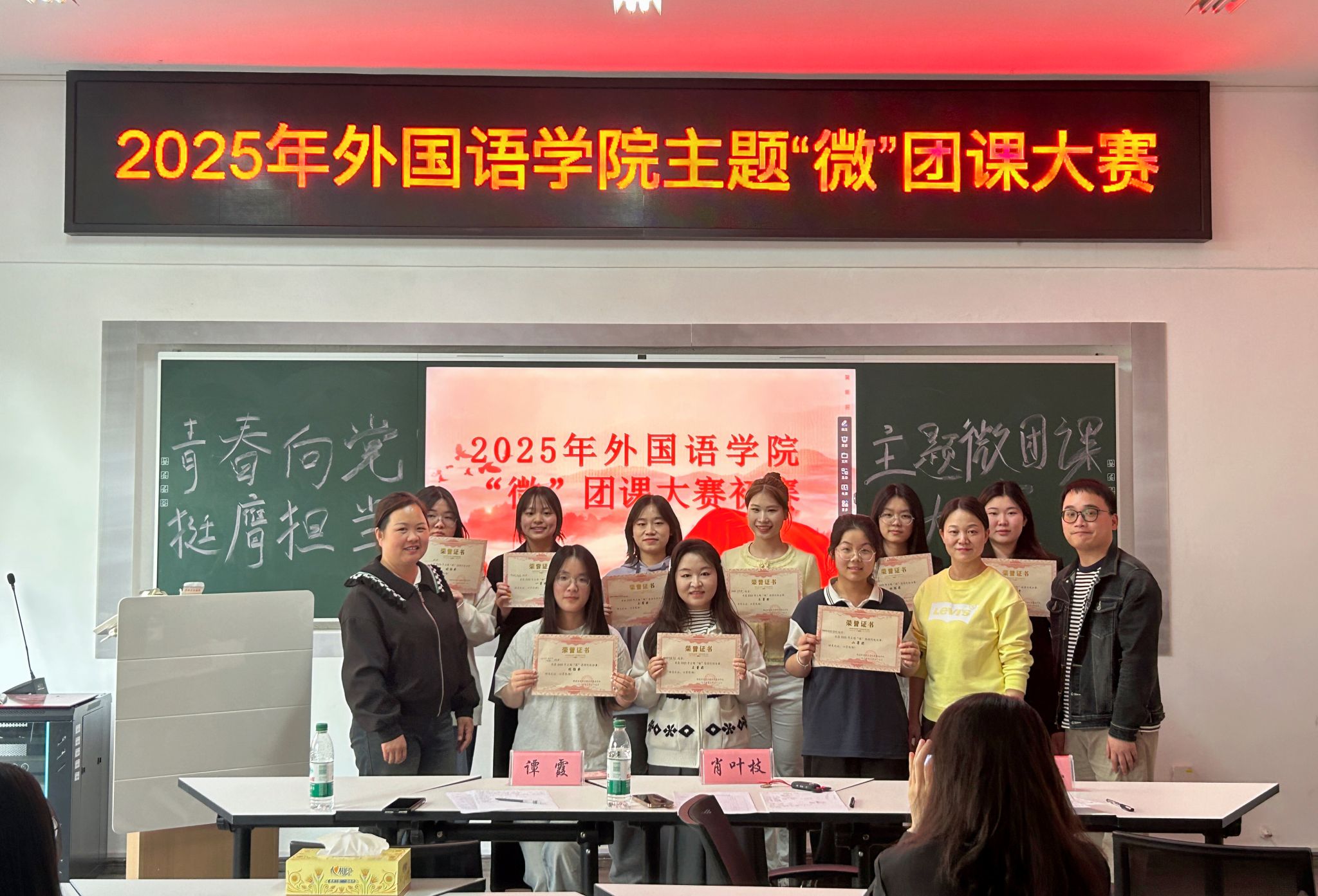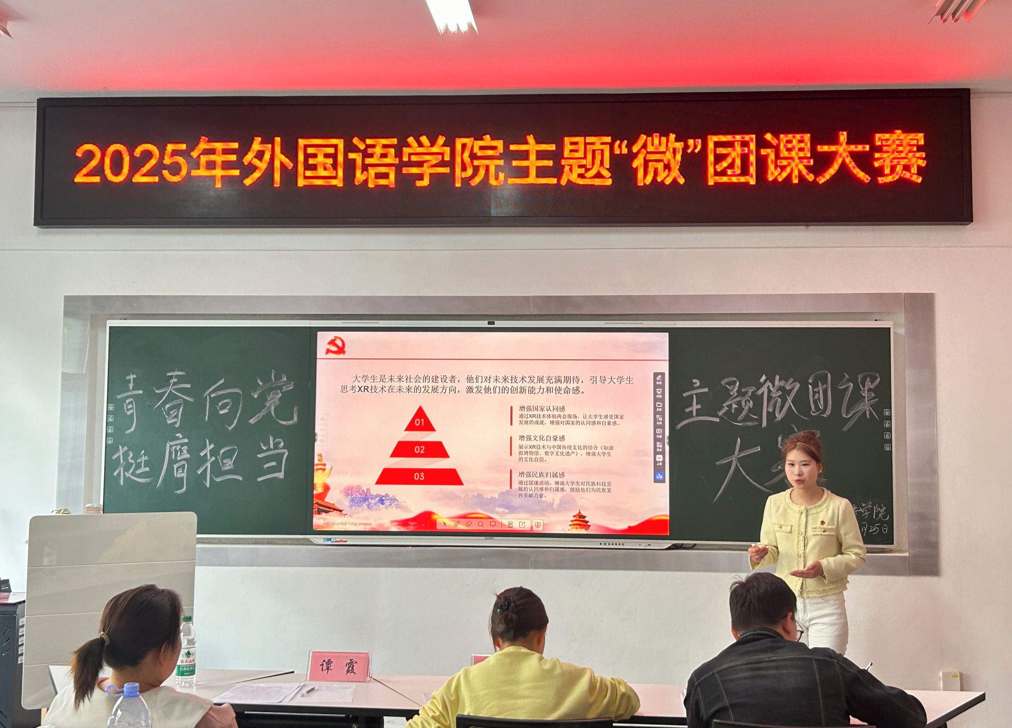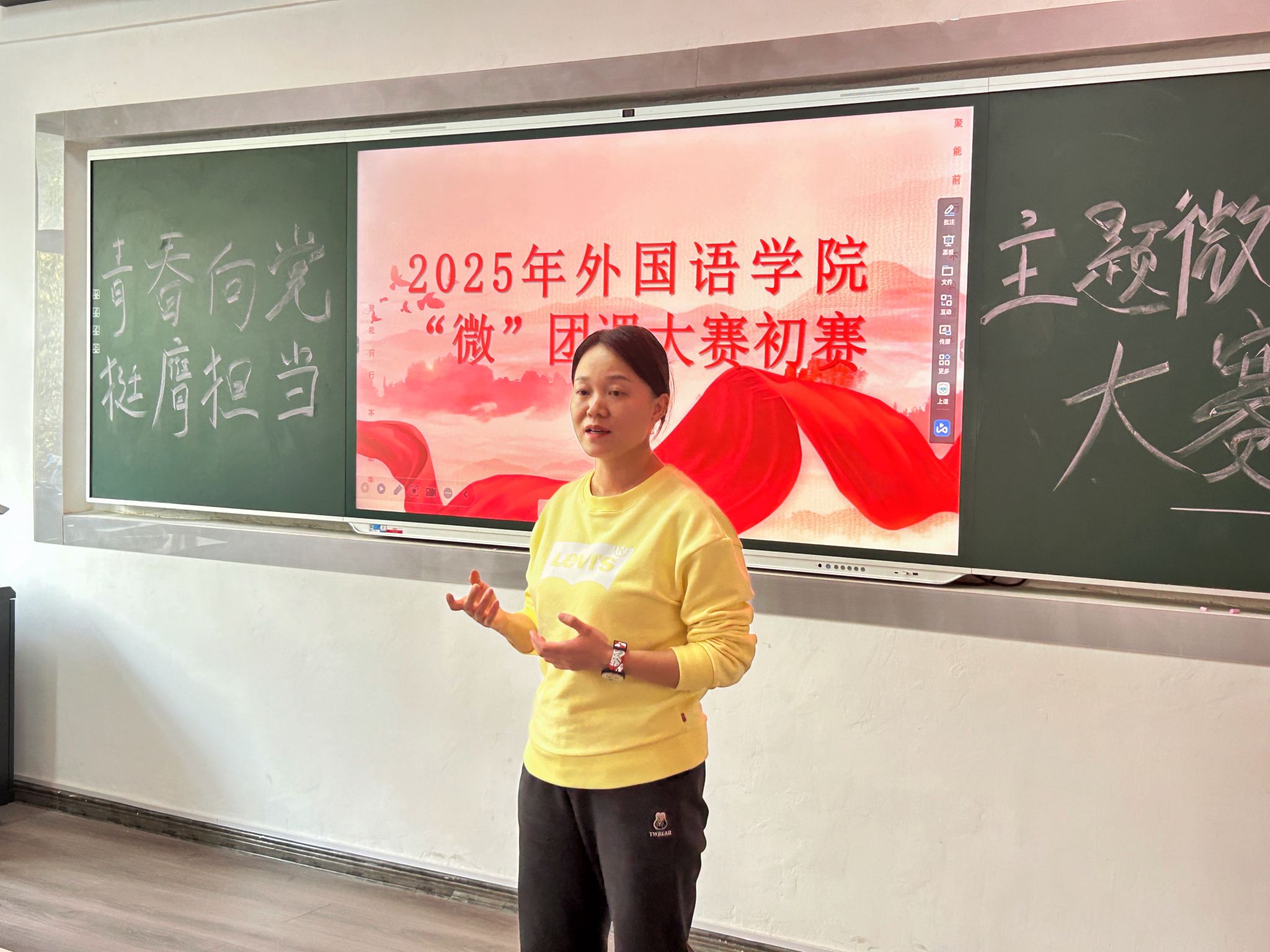 为深入贯彻落实习近平总书记关于青年工作的重要思想,进一步加强对团员和青年的思想政治引领与价值引领,搭建广大共青团员和青年展示自我、提升能力和思想交流的平台,3月25日下午2点30分,外国语学院于办公楼317举办“青春向党,挺膺担当”主题微团课大赛。外国语学院学工办主任肖叶枝、团总支书记胡文志、辅导员谭霞担任评委。