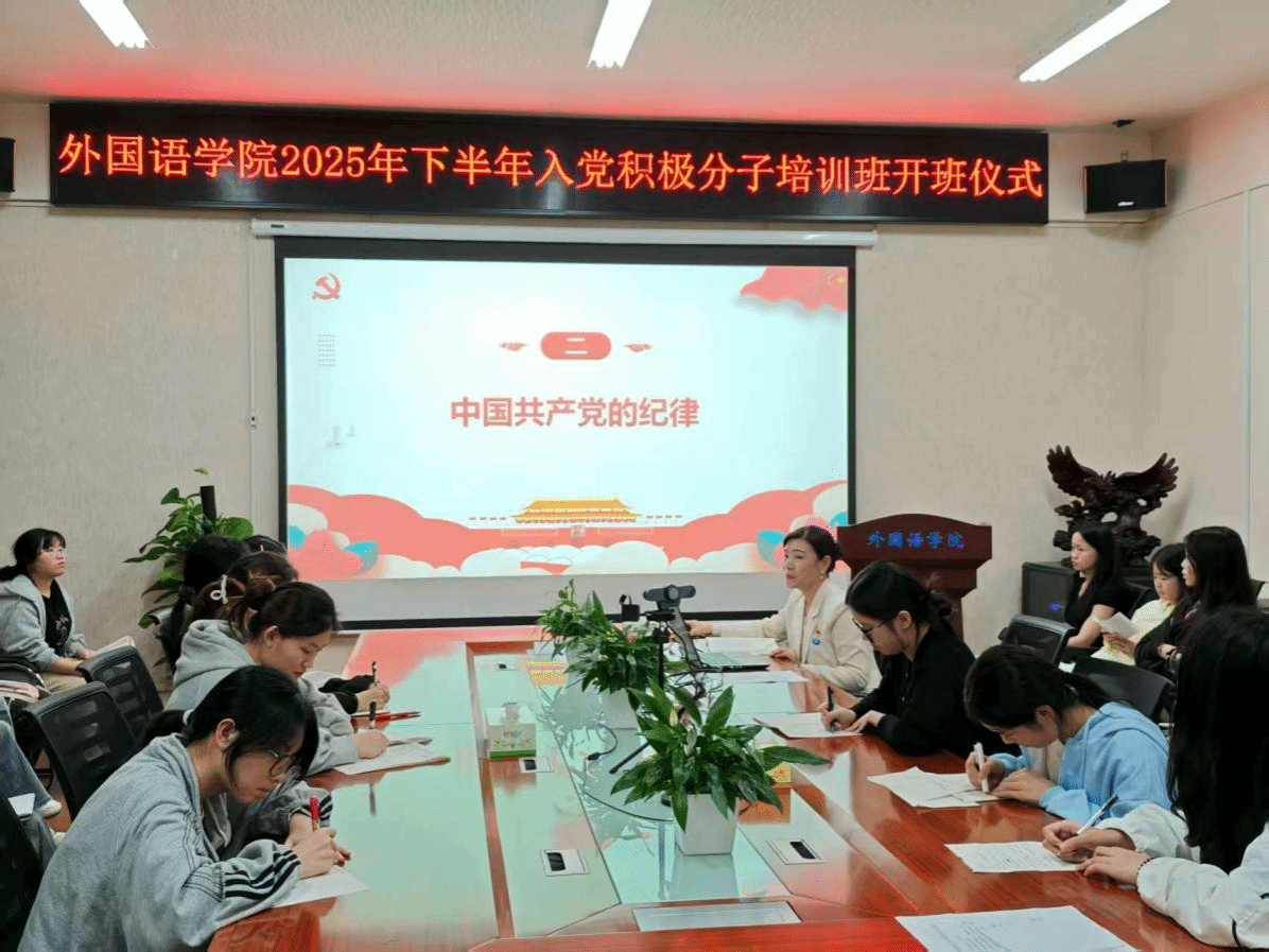 (本网讯)9月25日晚,外国语学院2025年下半年入党积极分子培训班开班仪式在办公楼315-1会议室隆重举行。出席会议的有院党委书记凌飞、党委副书记张鹏、学工办主任肖叶枝、学生第一党支部书记杨舒淇、学生第二党支部书记胡文志、团总支书记代承轩。2025年下半年全体入党积极分子参加开班仪式,会议由杨舒淇主持。