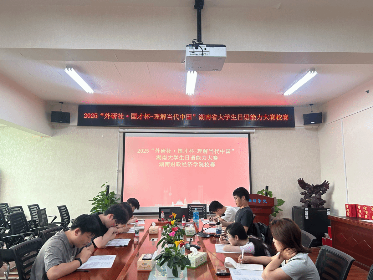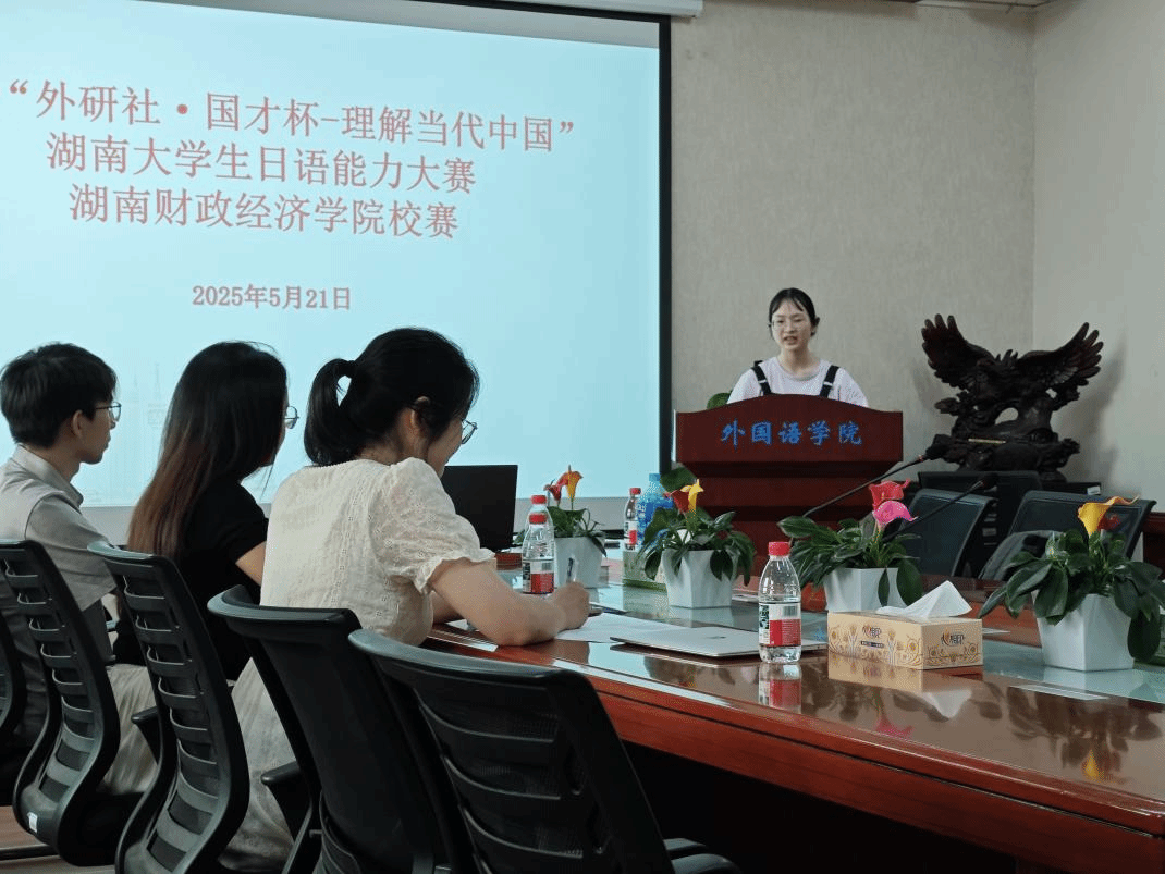 (本网讯)为积极响应关于加强文化传播与国际交流的号召,全方位提升日语专业学生的综合素养,5月21日下午,外国语学院在主校区办公楼315会议室举办 “外研社·国才杯”“理解当代中国”湖南省大学生日语能力大赛校赛。本次比赛分为笔试和即兴演讲两个部分,由何雨瑾、秦瑶、刘品原三位老师担任评委。比赛旨在考查学生的日语综合运用能力,不仅吸引了众多日语专业的学生,有日语基础、对日语有浓厚兴趣的非专业学生也踊跃参与。