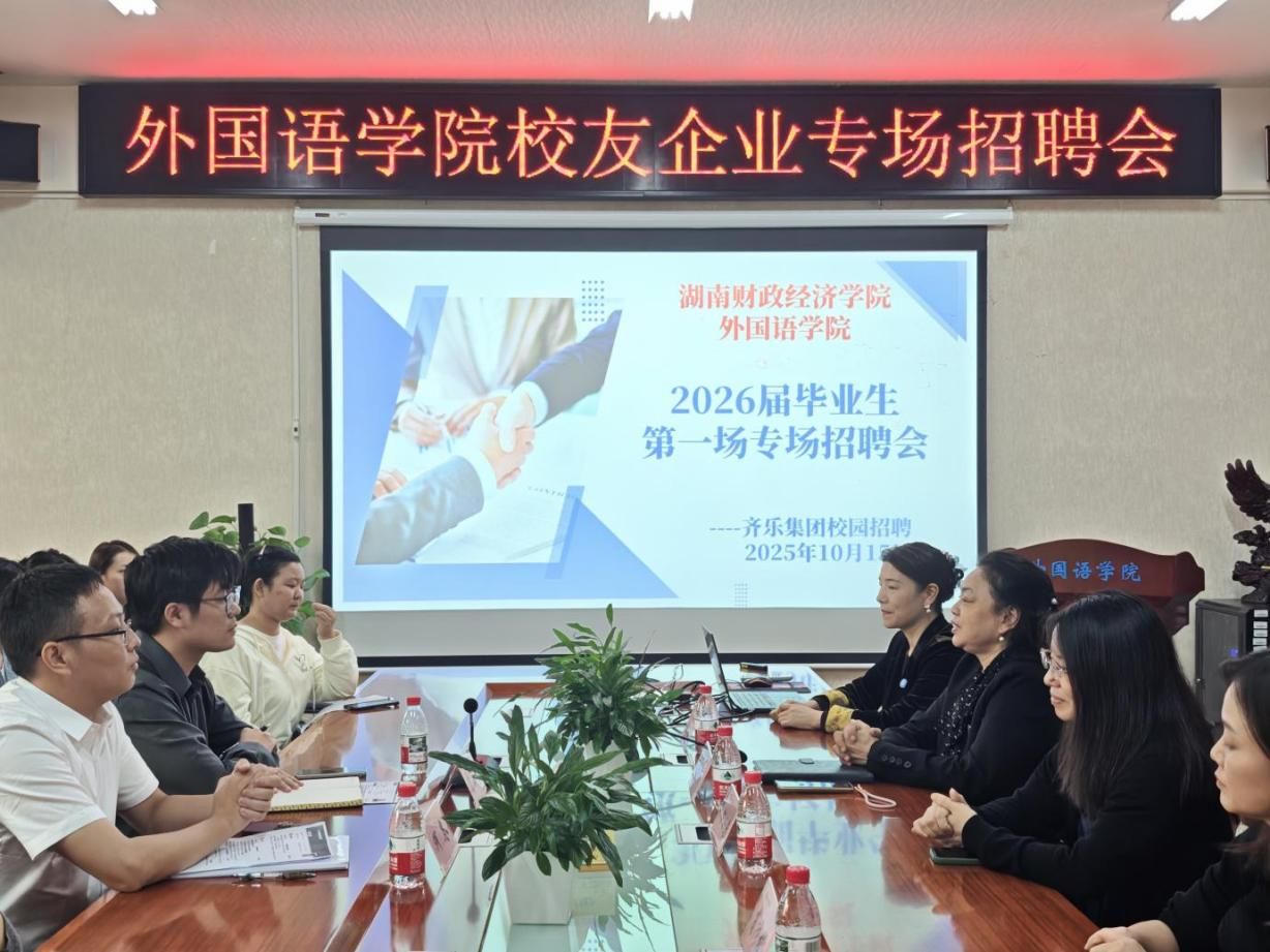 (本网讯)10月15日下午,外国语学院2026届毕业生第一场校友企业专场招聘会在学院会议室顺利举行。本次招聘会特邀校友企业——齐乐模具开展专场宣讲,吸引了四十余名应届毕业生积极参与。