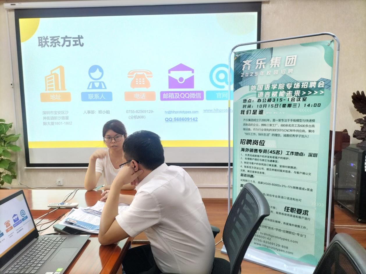 宣讲会上,深圳齐乐集团相关负责人结合企业发展历程、企业文化、业务布局及人才需求,全面介绍了公司概况及招聘岗位信息,齐乐集团目前是一家拥有三家工厂及多家贸易公司的集团公司,是一家专业手办模型和快速模具制造的公司,总部坐落于宝安沙井繁华中心星际大厦。作为校友企业,集团与学院建立了长期合作关系,并已签订实习就业协议,每年通过线上和线下的形式进行专场招聘。近五年连续每年都来学院选聘优秀毕业生,企业职员中最多时有50余名来自本院,截至目前仍有40余名在职员工为外国语学院毕业生。企业负责人表示,学院毕业生综合素质高、责任心强、适应能力快,在工作中展现出了良好的语言能力和职业素养,深受公司上下认可。