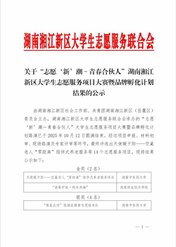 (本网讯)为促进高校志愿服务项目化、专业化与品牌化发展,10月12日下午,由湖南湘江新区社会工作部、共青团湖南湘江新区(岳麓区)委员会主办,湖南湘江新区大学生志愿服务联合会承办的“志愿‘新’潮-青春合伙人”大学生志愿服务项目大赛暨品牌孵化计划路演,于湖南湘江新区桔子洲街道学堂坡社区成功举行。我院语翼飞翔志愿服务队凭借“语翼护航·校社共融”项目,从十余所高校,七十多个参赛项目中脱颖而出,荣获大赛金奖。