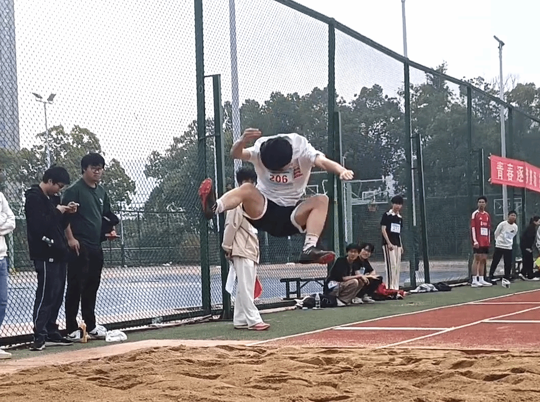 田赛区域同样精彩纷呈,一道道优美的弧线划破天际。助跑、起跳、落地,一系列动作流畅而有力,沙坑上的每一次飞跃,都是运动员毅力与爆发力的完美诠释。我院邱靖皓和谭磊同学凭借高超的跳远技巧在沙场上力压群敌,最终斩获跳远男子组冠军和亚军。