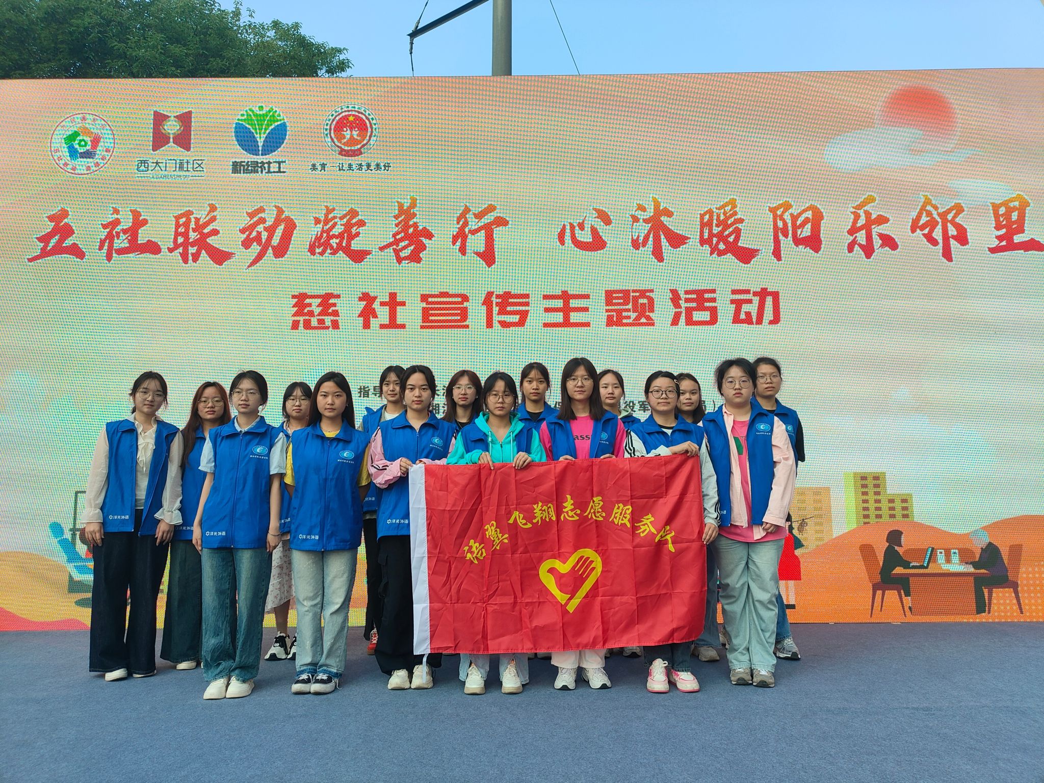 (本网讯)为扎实推进“五社联动 幸福邻里”工作走深做实,促进慈善与社工服务高质量融合发展,10月10日上午,西大门社区在向日葵广场举办了“五社联动凝善行,心沐暖阳乐邻里”慈社融合宣传活动。本次活动由长沙市民政局、湘江新区民政和社会保障局、湘江新区咸嘉湖街道工委指导,咸嘉湖街道西大门社区居民委员会主办。外国语学院作为共建单位受邀参与此次活动,学院党委书记凌飞、副院长汪小英、副书记张鹏以及行政党支部全体党员和16名语翼飞翔志愿服务队成员一同参与。