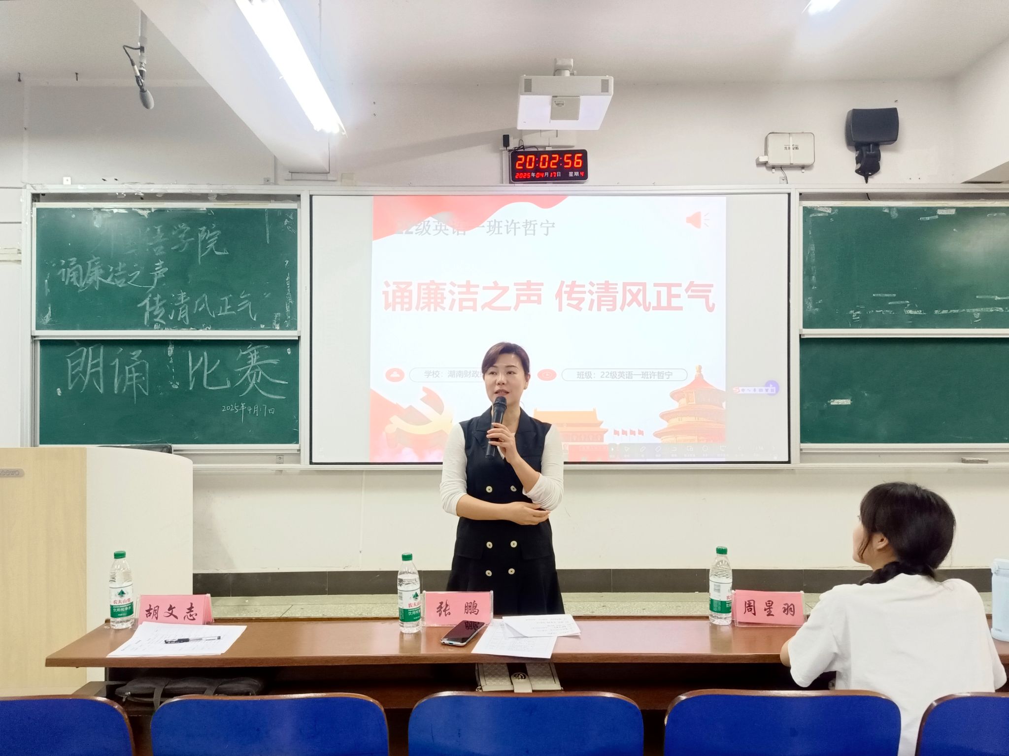 为深入推进新时代廉洁文化建设,以青年之声传递清风正气,4月17日晚上7点,外国语学院在主校区3110教室成功举办“诵廉洁之声,传清风之气”主题朗诵比赛。外国语学院党委副书记张鹏、院团总支书记胡文志及校主持队艺术团成员周星羽担任评委。