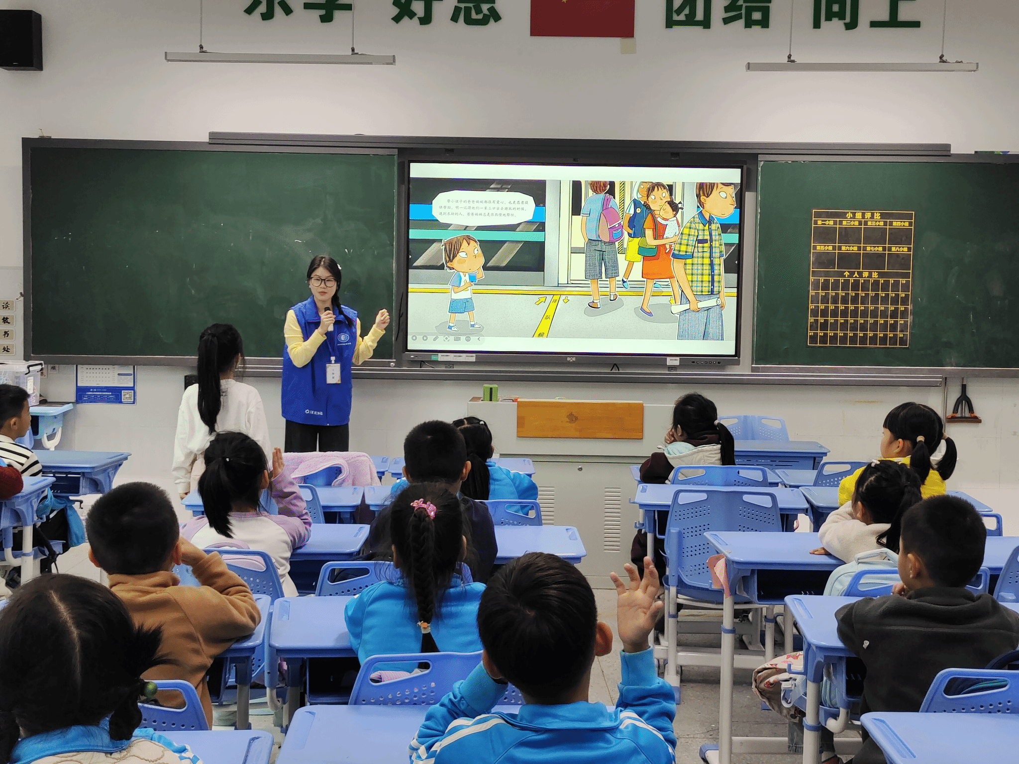 课堂上,志愿者们延续分组授课模式,结合绘本中儿童易理解的生活场景,用生动通俗的语言讲解走失后“保持冷静、正确求助”的核心要点,重点引导孩子们牢记“向穿制服工作人员、警察军人、带小孩的一家人求助”的安全准则。志愿者们通过针对性提问引发思考,配合趣味互动调动孩子们的参与热情,让原本严肃的安全教育变得鲜活易懂。