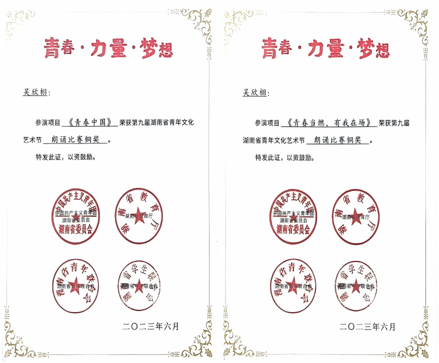 十多年前,我便对主持怀揣热爱与向往,虽家庭条件受限未接受专业指导培训,且外形不占优势,还遭诸多冷嘲热讽与否定,但我毫不气馁。初入校园便入选校主持队,我坚持训练、虚心求教,利用空教室反复练习,终于在2023年以“首选主持人”身份主持校青志协18周年汇演,实现蜕变。此后,我连续主持校五四表彰大会、90周年校庆文艺汇演、大四毕业典礼、影像艺术节等30余场大型活动,荣获湖南省青年文化艺术节朗诵铜奖以及校园主持人大赛、五四演讲大赛、中华经典诵读大赛等多项大赛前四名荣誉,还数次在开学典礼、毕业典礼、军训阅兵式等重要场合担任朗诵嘉宾。