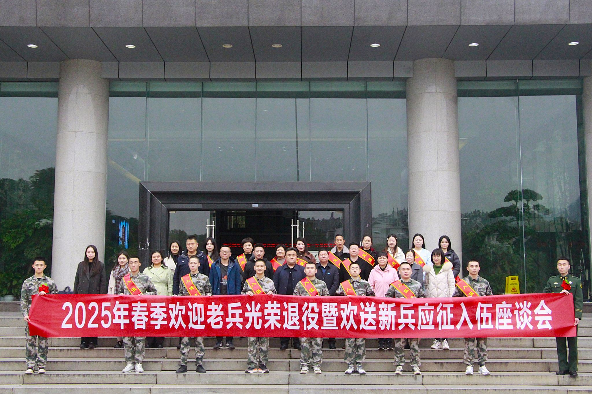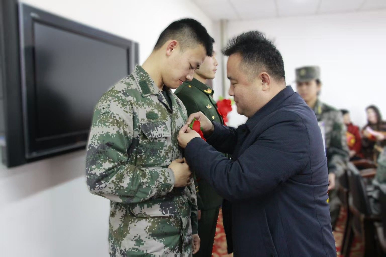 最后,退役老兵为入伍新兵佩戴“入伍光荣”绶带,赠送纪念品。