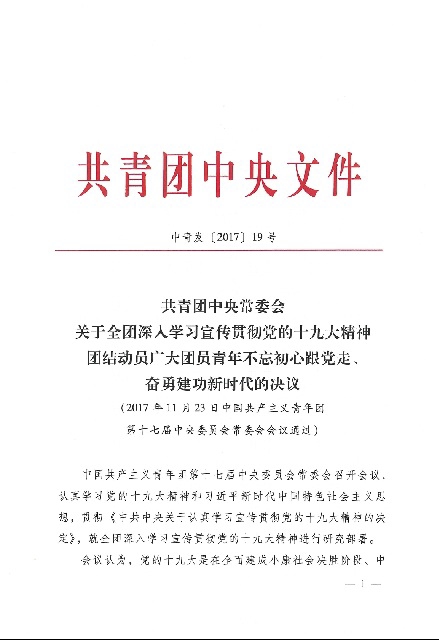 共青团中央常委会关于全团深入学习宣传贯彻党的十九大精神 团结动员广大团员青年不忘初心跟党走、奋勇建功新时代的决议