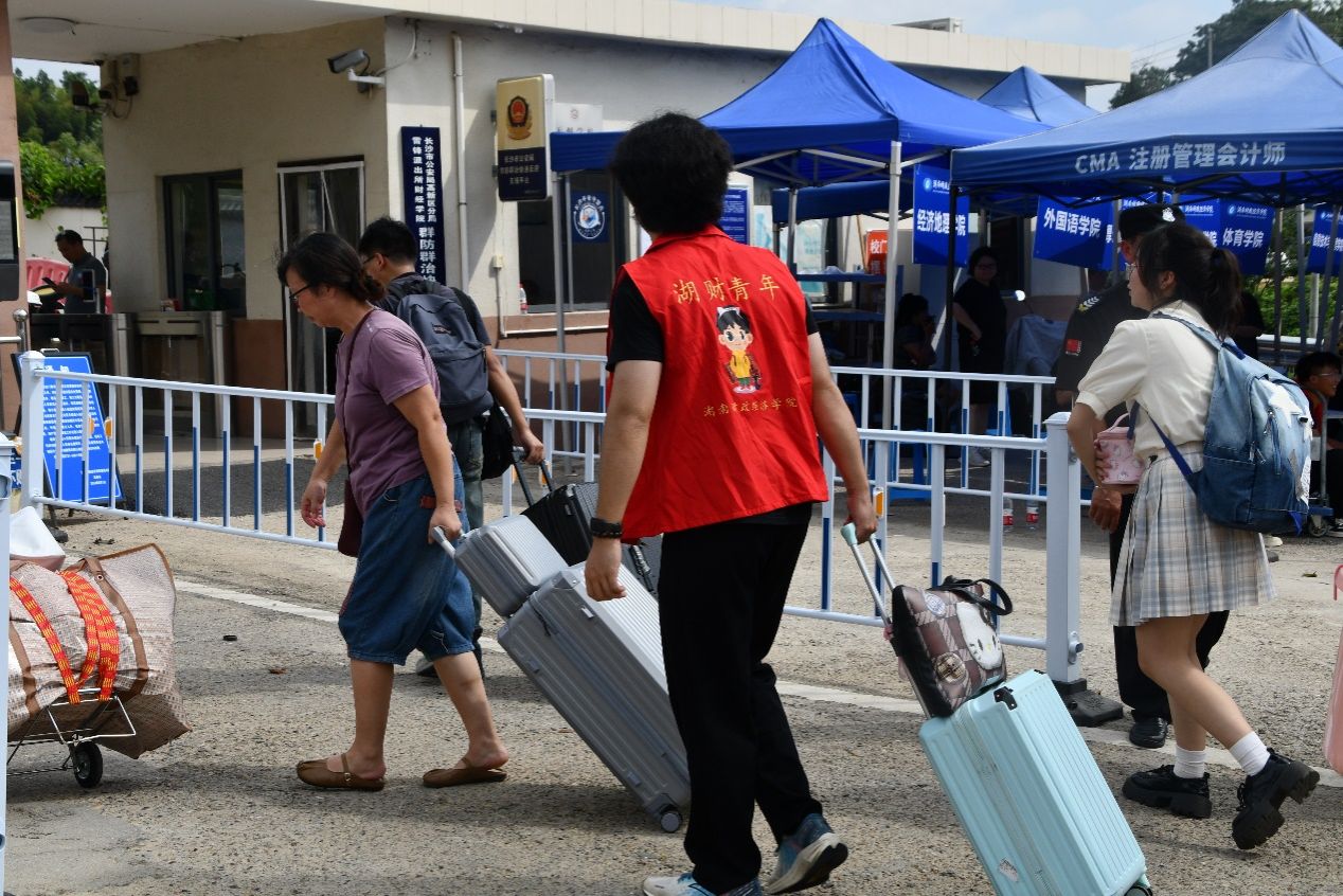 火车站、汽车站……人潮中早有一群“湖财青年”高举“接站牌”在此等候,他们热情迎接每一位新生,耐心指引乘车路线,详细解答报到中各种疑问。学校附近的谷苑路、五松路上迎新横幅随风飘扬,“红马甲”“蓝马甲”穿梭不停,挥手指引、搬运行李,帮助新生搭乘“校园接驳车”一路护送至雷锋书院。从车站到学校、从迷茫到安心,湖财青年用行动诠释“我们与你同在!”