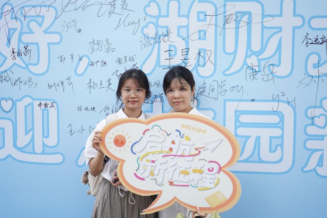 校团委服务点也超有料!不仅设置了团员关系转接咨询处还特别布置了一面趣味签名墙,吸引诸多新生驻足于此。新生执笔签名、打卡互动便收获了一份精美礼品!一份小礼物凝聚的是湖财青年真诚的心意。光影之间,笑脸绽放。无数青春身影在此留下初入湖财的成长印记!