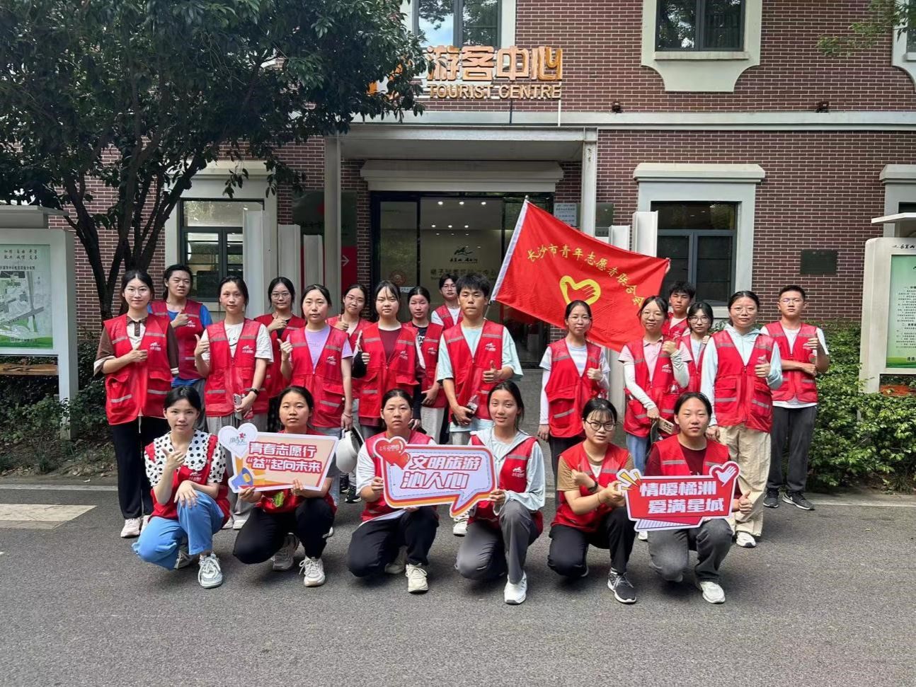 在橘洲洲头、岳麓山畔,湖财青年身着红马甲,忙碌的身影遍布景区。在地铁出口,他们热情接待每一位游客,为其提供简单的旅游咨询;在游客中心,他们耐心解答游客疑问,积极协助景区工作人员开展行李寄存、医疗救治等服务;在景区步行入口,他们积极帮助游园旅客进行预约,引导游客依规有序入园。他们纷纷化身一抹抹“橘洲红”、“麓山红”,为景区再添一道靓丽的风景线。