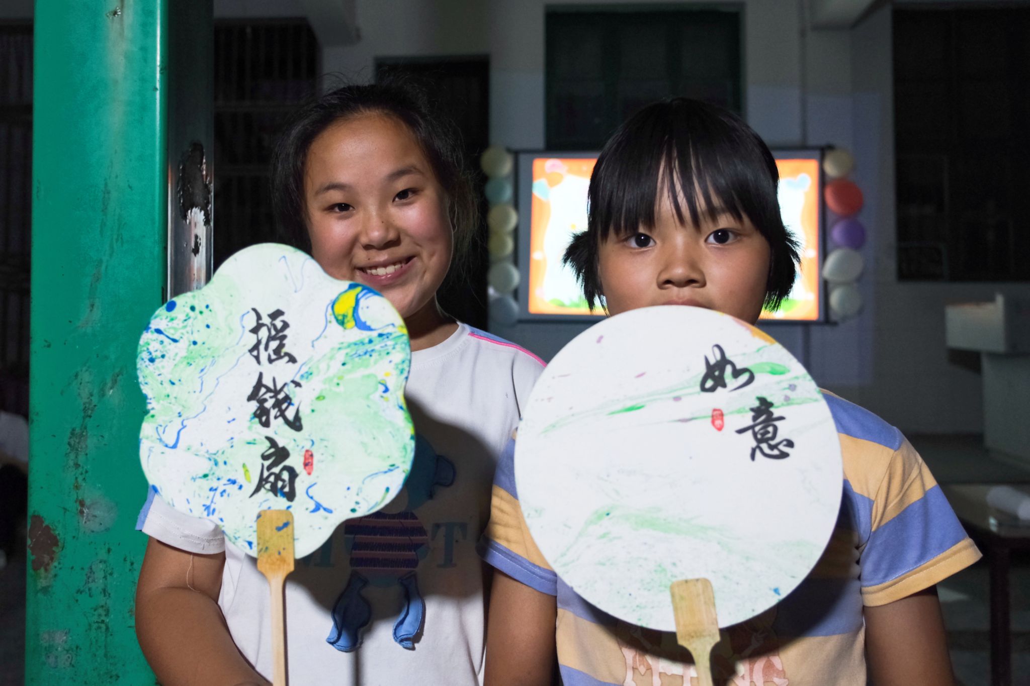 (图为语翼飞翔志愿服务队带领孩子们制作的漆扇展示 卿孝娴摄)