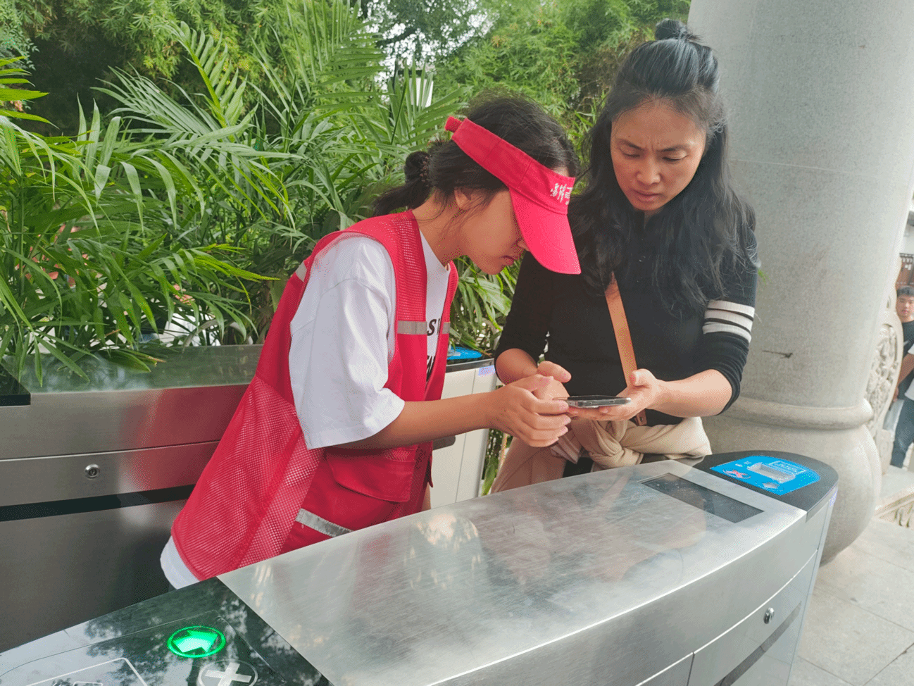 (图为Beat365青年志愿者刘盼协助游客扫码入园 刘康摄)