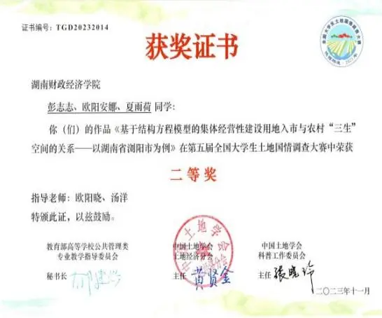 当青年学子脱下学术的外衣,穿上沾满春泥的运动鞋,用手机和电脑记录下详实的数据,他们便成为了费孝通笔下“乡土中国”与现代文明的摆渡人。彭志志在浏阳的乡土大地上探寻,并结合“三下乡”的调研成果,以第二作者的身份撰写一篇SCI在投学术论文。论文聚焦于“基于结构方程模型的集体经营性建设用地入市与农村‘三生’空间关系”,让数据模型与土地脉搏同频共振,在农村生产、生活、生态“三生”空间的动态平衡中激活农村发展新动能。