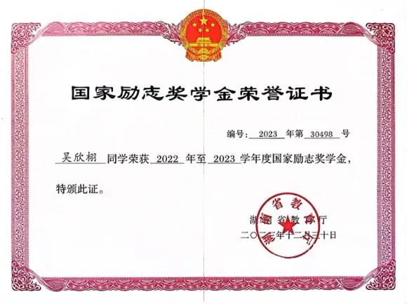 乘风破浪,直挂云帆:在生活的风雨中,总有一些人选择砥砺前行。吴欣栩就是这样的,为了减轻家庭负担,他努力通过兼职工作赚取自己的生活费和学杂费。考入湖财后,他更是将生活的压力和自己的理想转化为动力,不断地乘风破浪,成功获得了国家励志奖学金、校二、三等奖学金、三好学生、优秀学生干部、优秀团员等荣誉称号,以及获国家英语演讲比赛全国三等奖等国家级奖项2项,湖南省青年文化艺术节朗诵总决赛铜奖等省级奖项3项,外研社国才杯笔译大赛、用英语讲好中国故事短视频大赛一等奖等校级奖项23项。