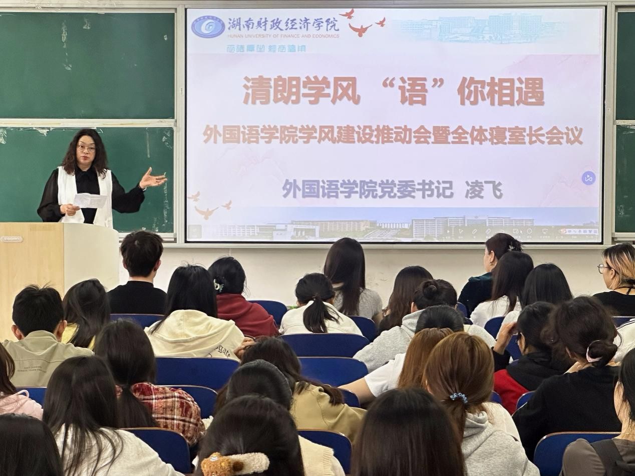 为加强学风建设,规范大学生日常行为管理,切实发挥寝室长在学生管理工作中的纽带作用,4月22日12点30分,外国语学院在主校区3110教室召开学风建设暨寝室长会议。外国语学院党委书 记凌飞、党委副书记张鹏、学工办主任肖叶枝、辅导员胡文志、 谭霞 以及各年级全体寝室长参加会议。会议由肖叶枝主持。