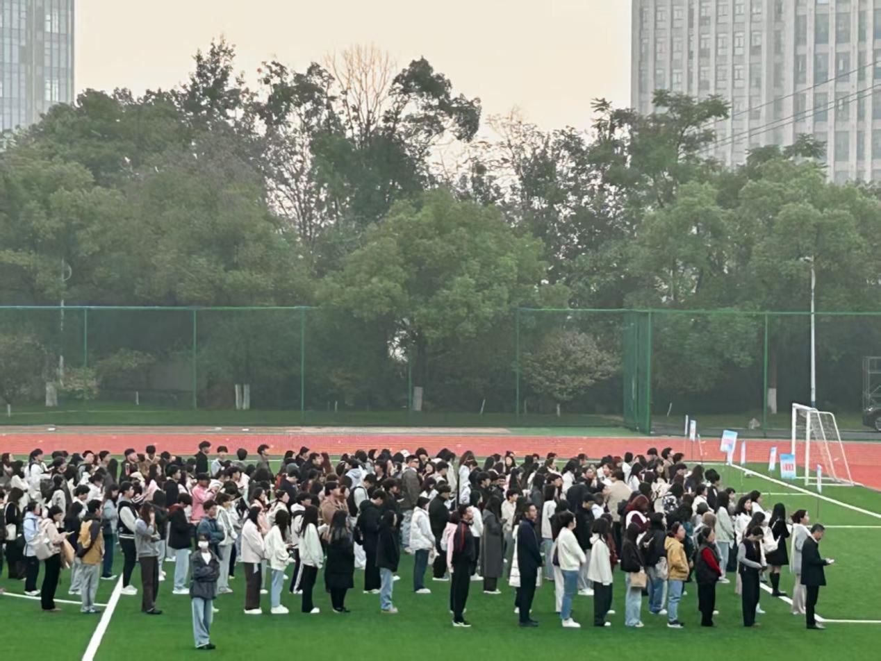 仪式开始,国旗护卫队迈着铿锵的步伐护送国旗入场,《义勇军进行曲》响彻整个田径场。在全体师生庄严的注目礼中,鲜艳的五星红旗冉冉升起。