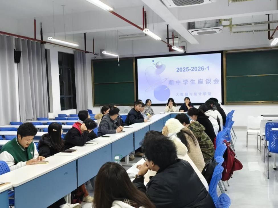 为全面了解开学以来教育教学工作的开展情况,倾听学生心声,营造更为优良的育人环境,大数据与统计学院于11月17日晚分别在雷锋书院L1302教室、主校区3403教室召开了期中学生座谈会。两个校区的座谈会分别由院长尹向飞、副院长吕胜祥主持,各专业各班学生代表及雷锋书院辅导员杨磊、学院教务办工作人员参会。