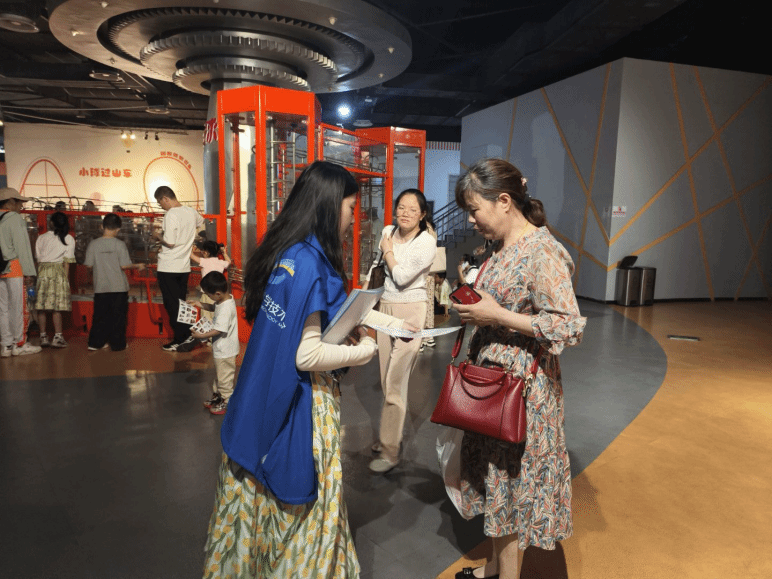 恰巧在五一假期期间,科技馆内人员流动大,志愿者身穿统一的志愿者服,穿梭于各个展区之间,为游客提供全方位的服务。