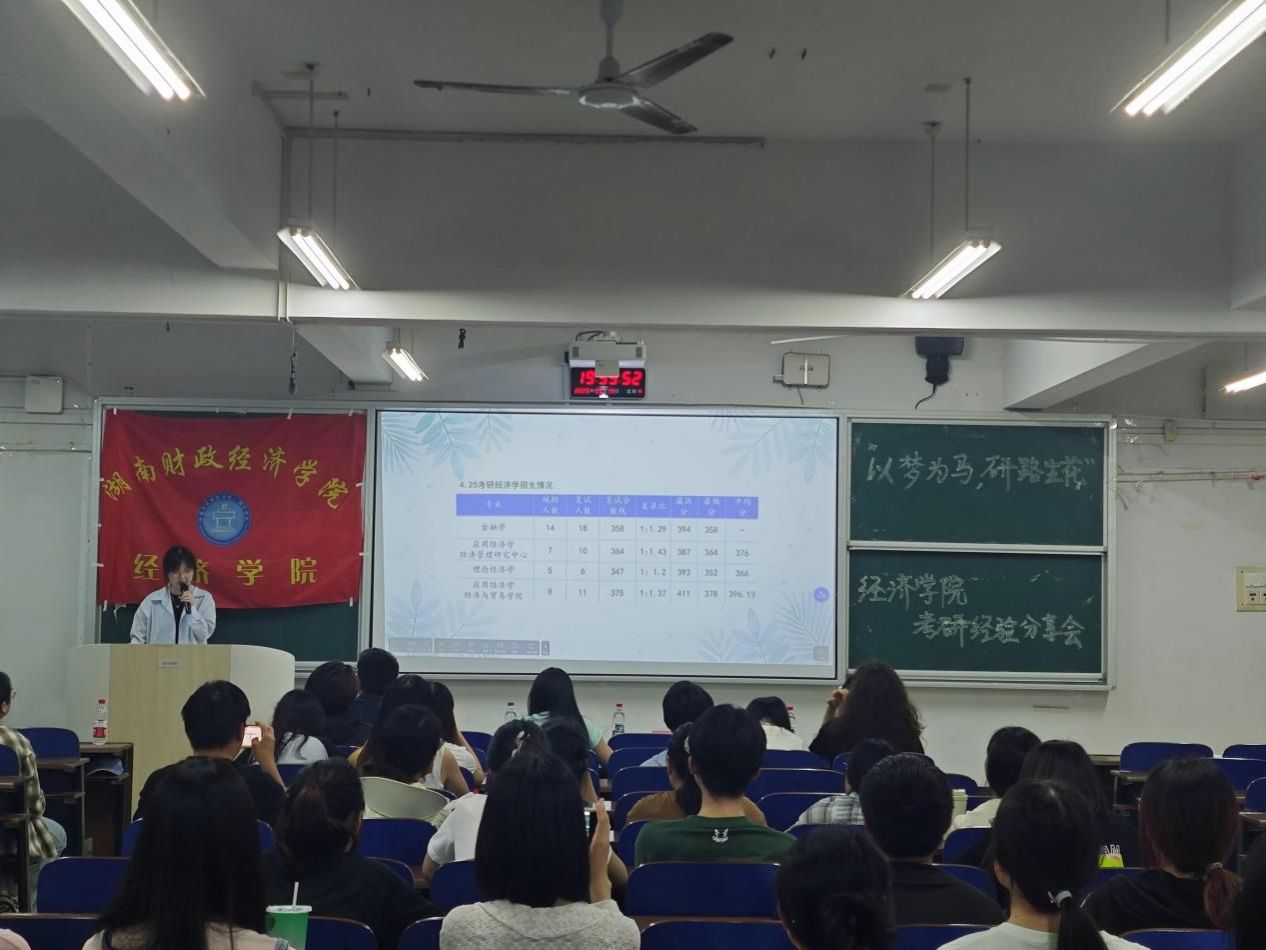 为助力学生深入洞悉考研政策、明确学习路径,并科学规划复习策略,经济学院于5月15日晚上19:00在3108成功举办了“以梦为马、研路生花”考研经验分享会。本次分享会特邀我院21级优秀考研上岸学生分享考研经验,参加本次分享会的有经济学院院长李勇辉、院党委副书记刘英、学工办负责人谢龙、26届辅导员王竹青以及22、23级意向考研的同学。