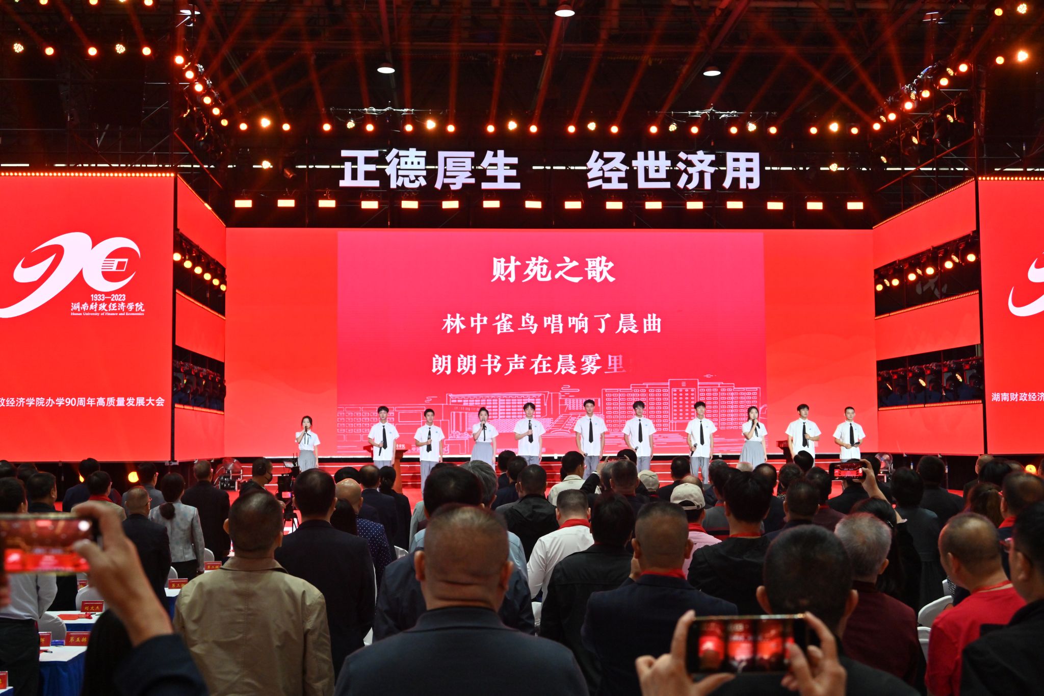 “岳麓山枫林在唱,湘江水涛声在唱,我们为社会和谐经济腾飞,谱写出新时代的华彩乐章。”最后一曲《财苑之歌》大合唱寄托了所有湖财人的情怀和理想,“正德厚生,经世济用”的校训将激励湖财人砥砺奋进、续写华章。