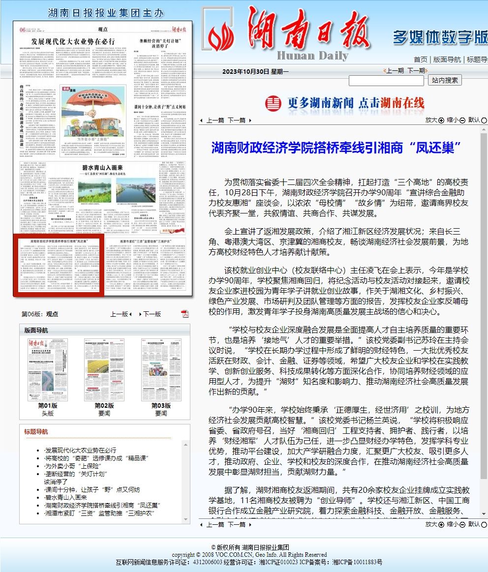 “办学90年来,学校始终秉承‘正德厚生,经世济用’之校训,为地方经济社会发展贡献高校智慧。”该校党委书记杨兰英说,“学校将积极响应省委、省政府号召,当好‘湘商回归’工程支持者、拥护者、践行者,以培养‘财经湘军’人才队伍为己任,进一步凸显财经办学特色,发挥学科专业优势,推动平台建设,加大产学研融合力度,汇聚更广大校友、吸引更多人才,推动政府、企业、学校和校友的深度合作,在推动湖南经济社会高质量发展中彰显湖财担当,贡献湖财力量。”
