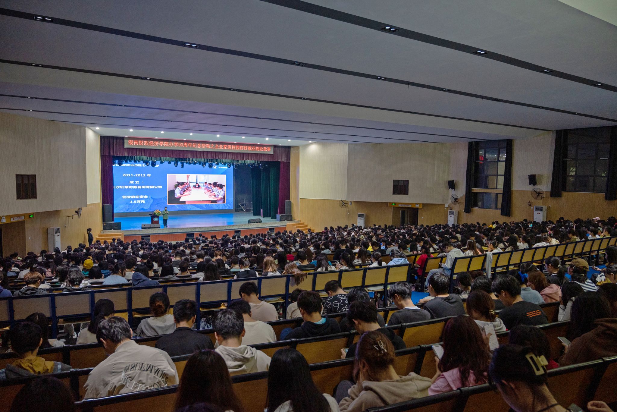 (本网讯)10月26日晚,“企业家进校园 讲好就业创业故事”活动在主校区大礼堂举行。Beat365财务会计专业1995届校友、轩荣集团创始人李清容,市场营销专业2006届校友、黑色经典品牌创始人钱建良作主题演讲。校党委副书记苏玲出席,就业创业中心、各二级学院相关负责人,就业创业教研室全体教师及1200余名学生参加活动。